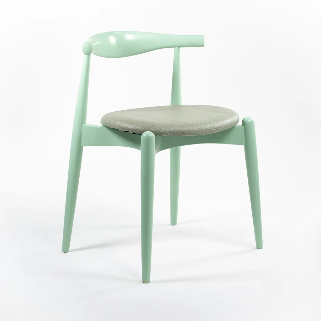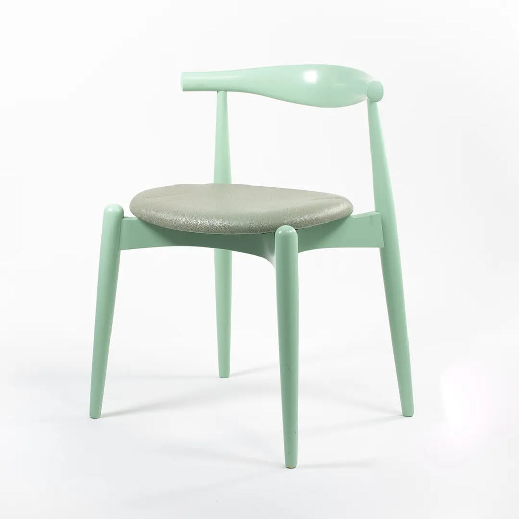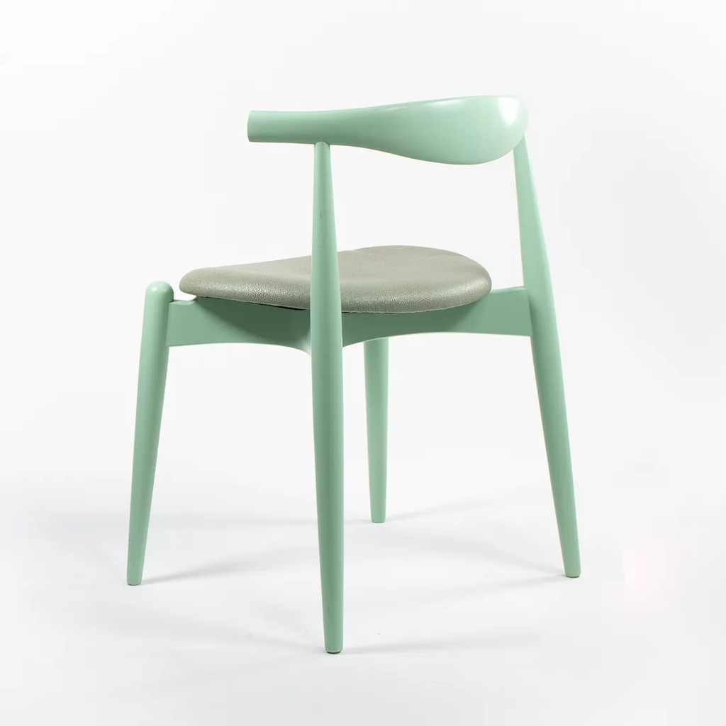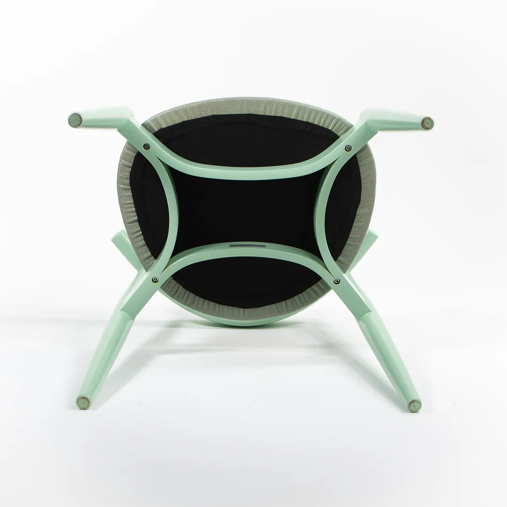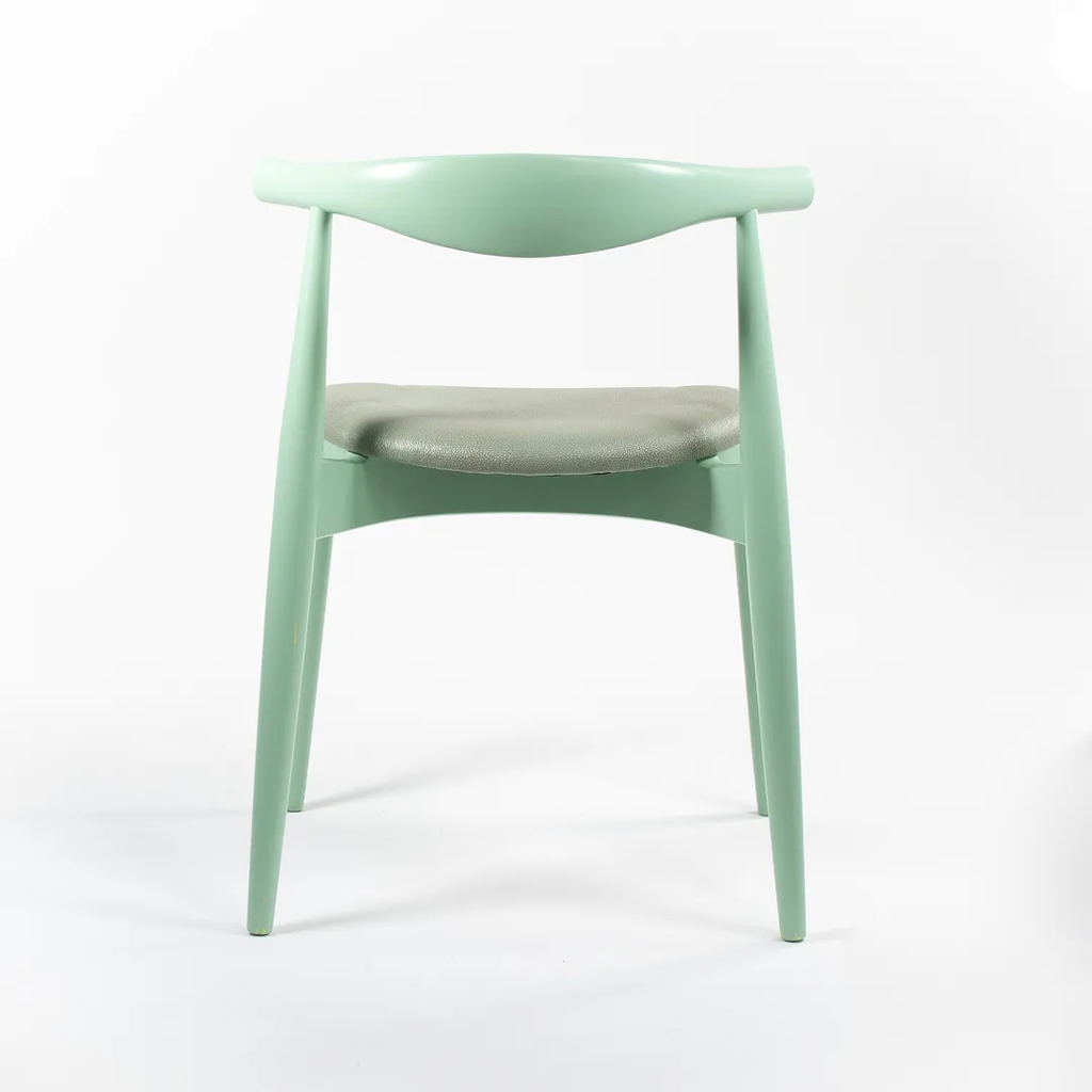 This is a CH20 Elbow Dining Chair made with a solid beech frame, painted mint green, and a green Chagrin leather seat (ordered COL or Customers Own Leather via Edelman leather most likely). The chair, designed by Hans Wegner and produced by Carl Hansen & Son in Denmark, dates to circa 2021 and is guaranteed as authentic. Condition is very good to excellent with some light wear from use. It was used a floor model within one of Carl Hansen's showrooms. See photos.