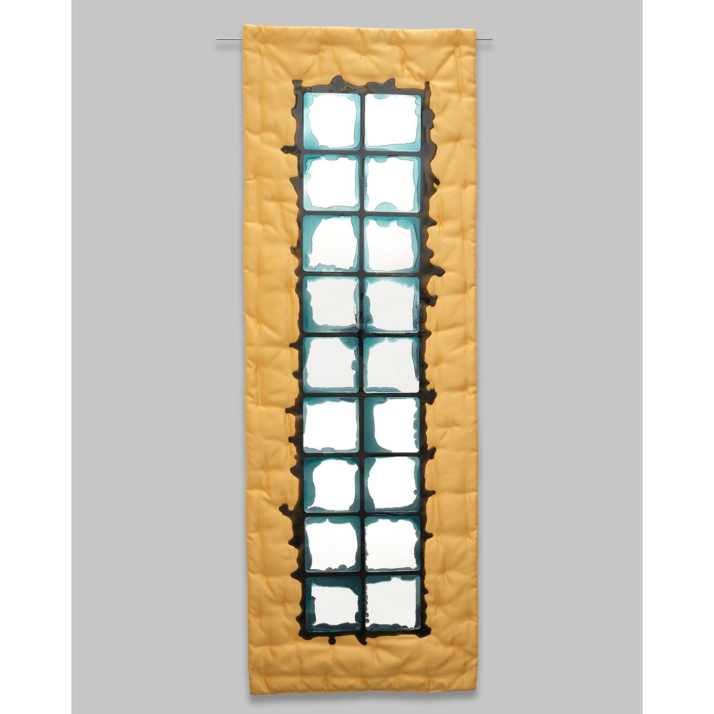 Mirrors that encourage a reimagined way of seeing oneself and the world. The mirrors in the Edizioni del Pesce collectino are exemplars of avant-garde design, featuring four distinct models that evoke the refined geometry of English windows. Each mirror is segmented into irregular panes, enhanced with fluid pours of plastic material and mounted on fabric, resulting in a captivating visual effect. These mirror do more than reflect; they transform images, creating reflections that seem to open portals to alternate dimensions, inviting viewers to look beyond the surface and into a world of altered perspectives.