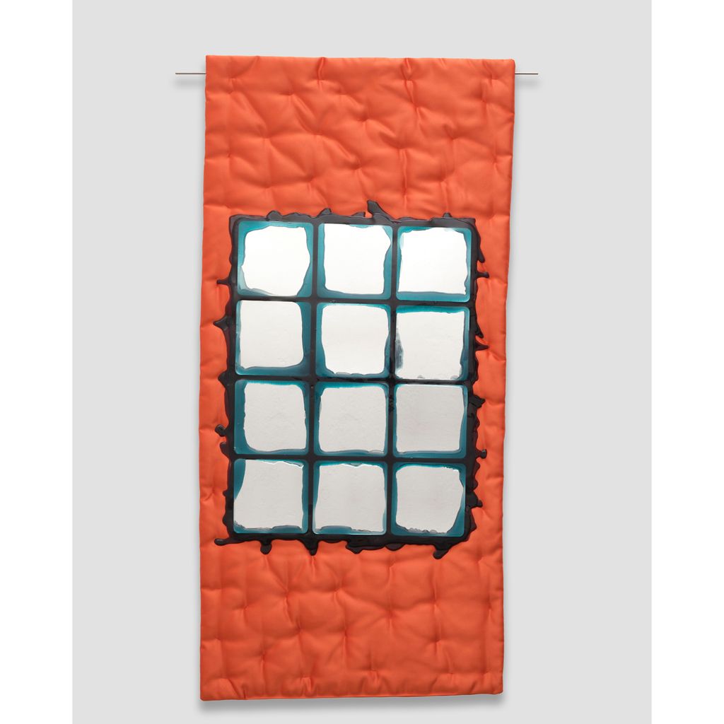 Mirrors that encourage a reimagined way of seeing oneself and the world. The mirrors in the Edizioni del Pesce collectino are exemplars of avant-garde design, featuring four distinct models that evoke the refined geometry of English windows. Each mirror is segmented into irregular panes, enhanced with fluid pours of plastic material and mounted on fabric, resulting in a captivating visual effect. These mirror do more than reflect; they transform images, creating reflections that seem to open portals to alternate dimensions, inviting viewers to look beyond the surface and into a world of altered perspectives.