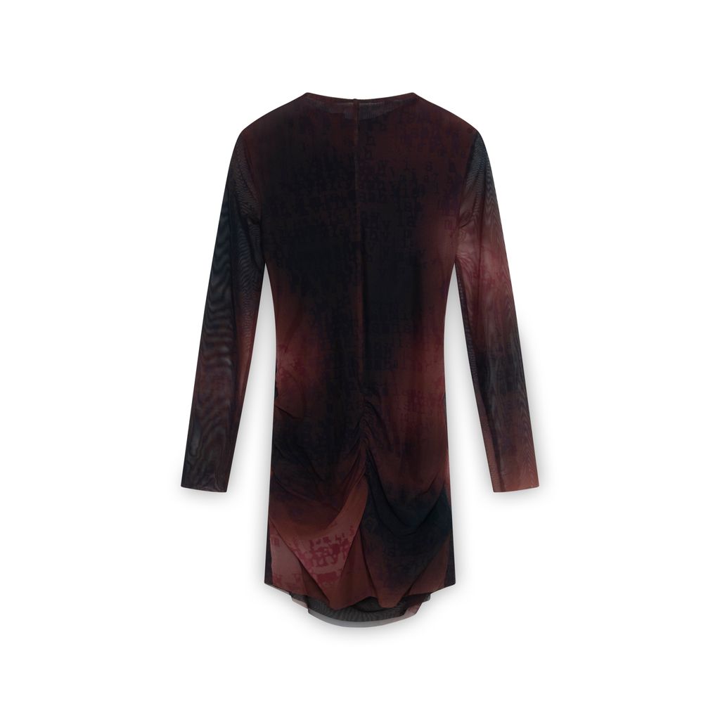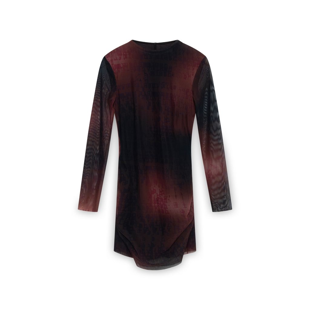 MISBHV Typewriter Mesh Minidress features black and red gradient, sheer construction, hidden zipper along shoulder, and ruching along back.