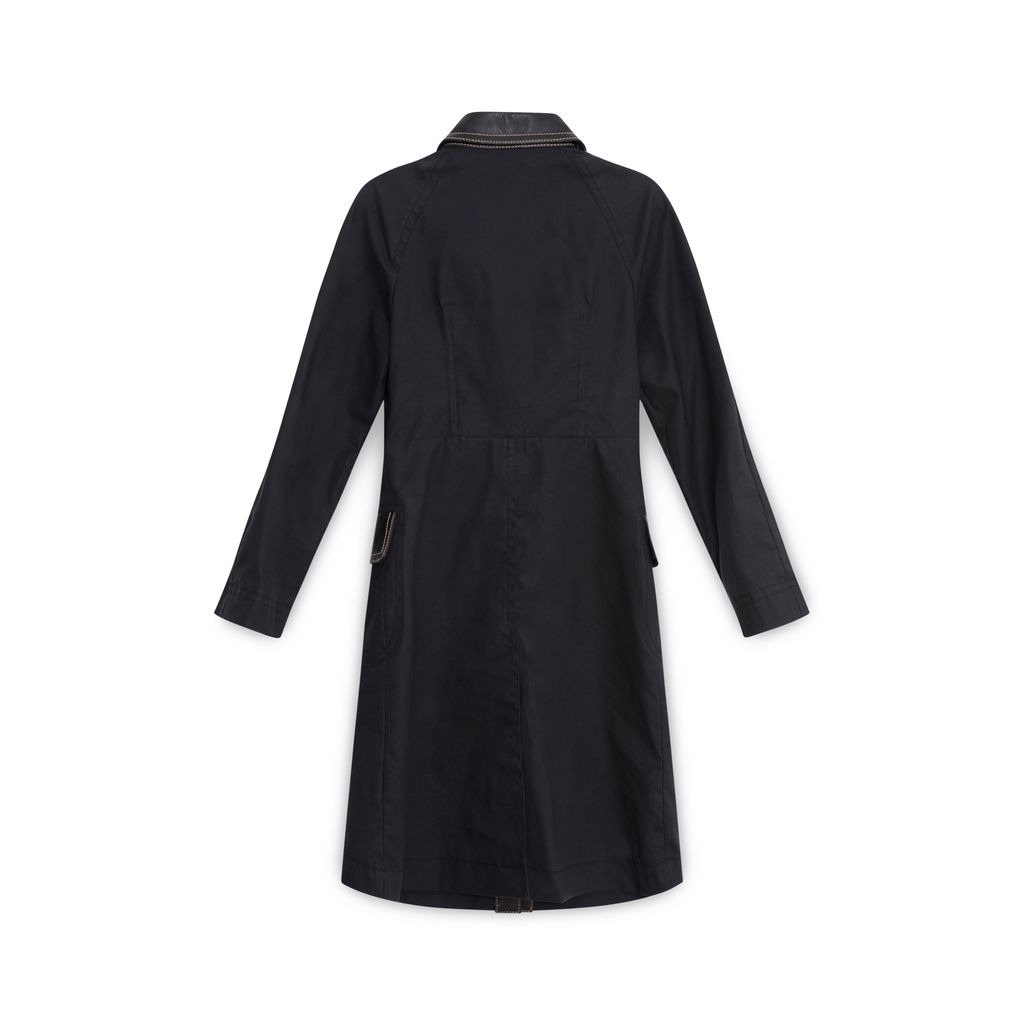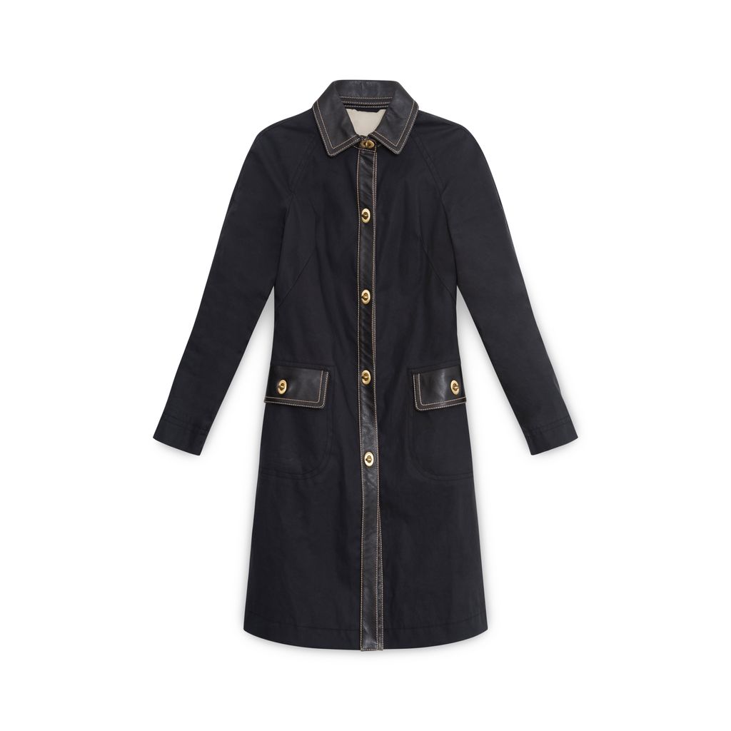 Miu Miu Leather Detail Trench Coat features leather collar and lining down front, turn-latch button closure, two front pockets.