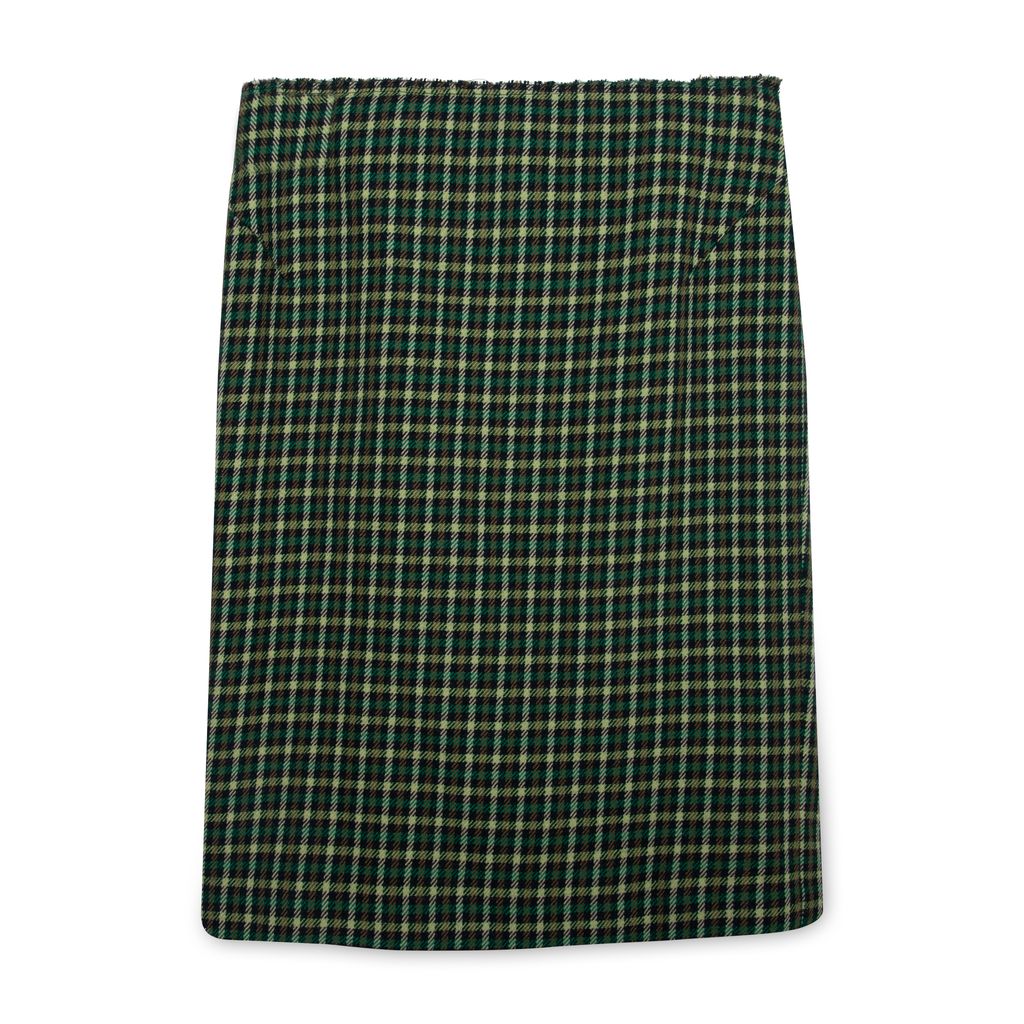 Miu Miu tweed pencil skirt features plaid patterns throughout withdraw waistline, and invisible zipper closure at back.