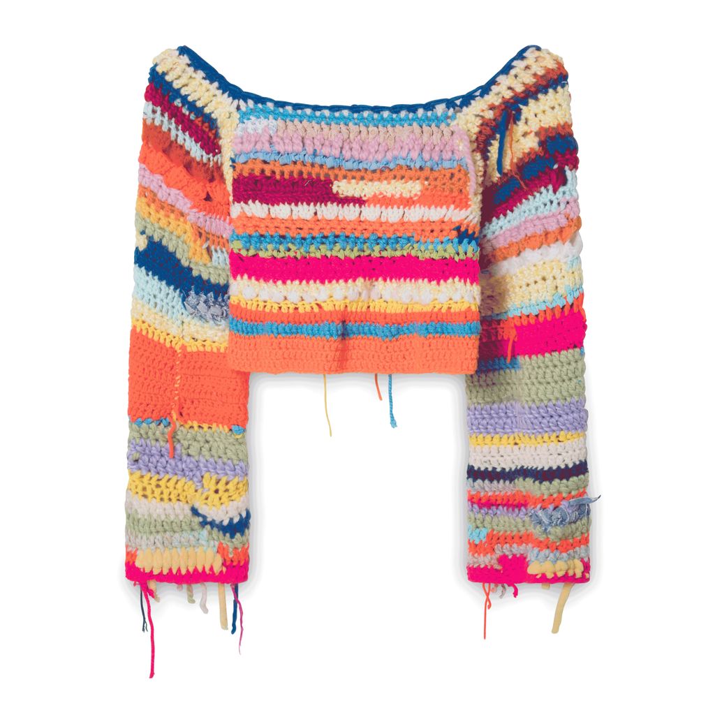 Mixed crop long sleeve sweater features a mixed yarn crochet.