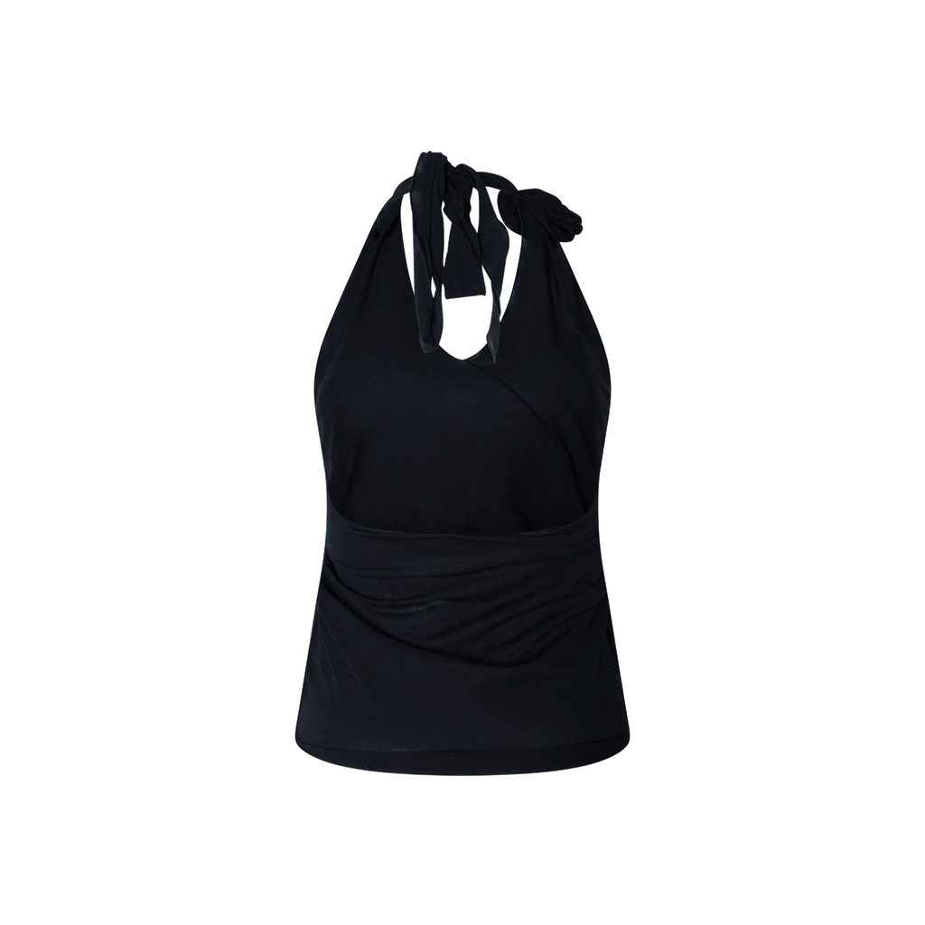 MNG Black Flower Halter Top features self tie halter with flower, V-neck, and low back.