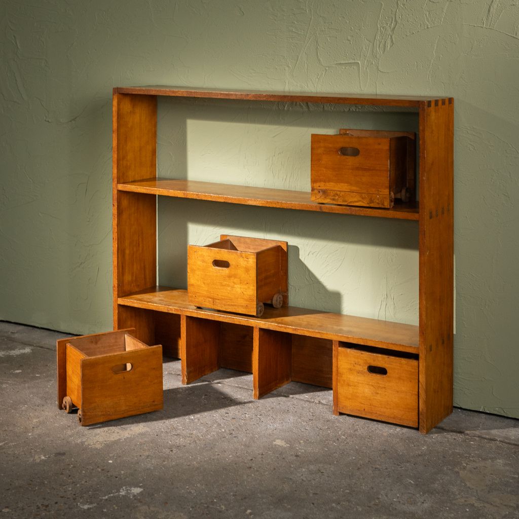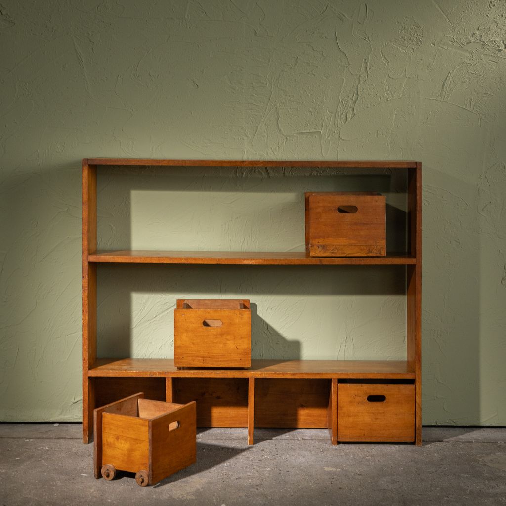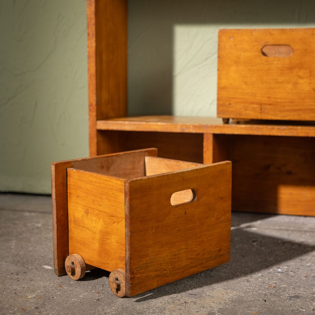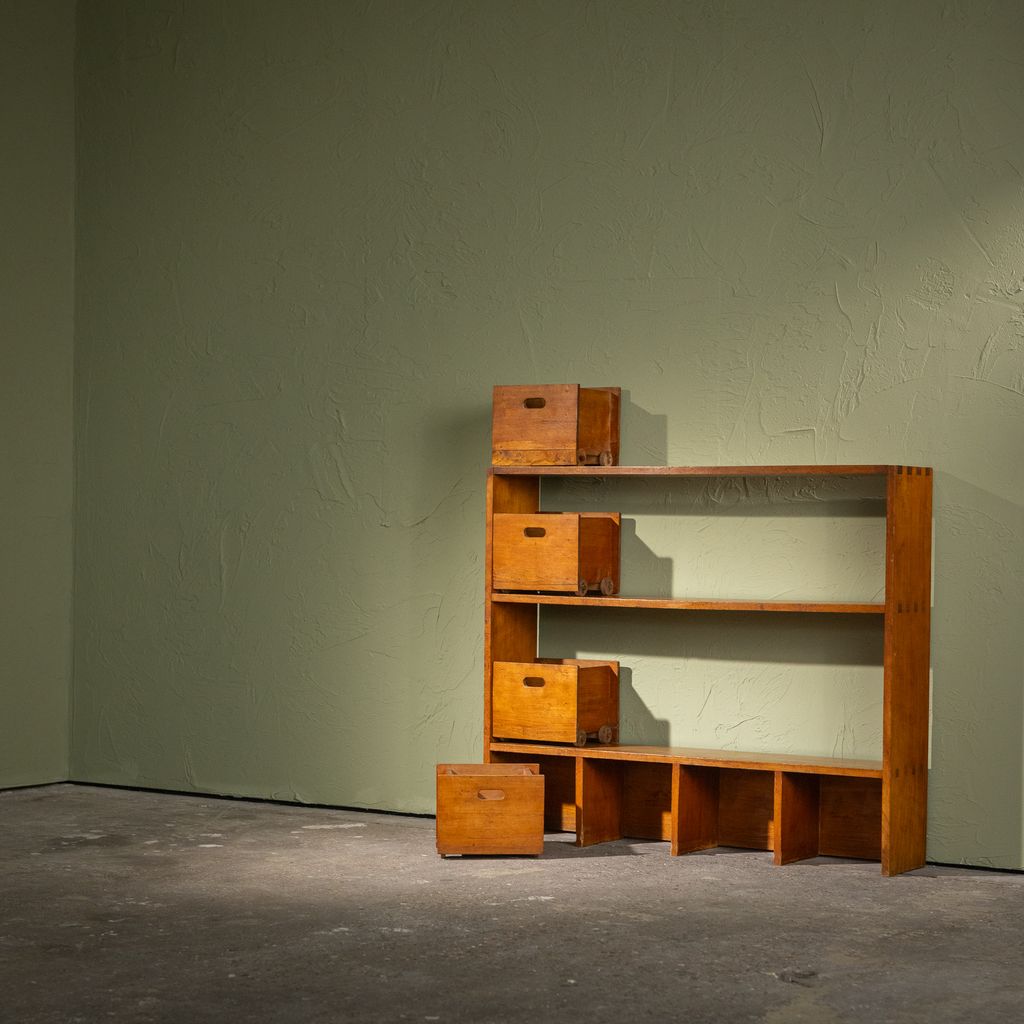The cabinet is made of stained beech and features fixed open shelves combined with removable wooden drawers, several of which are mounted on original wooden wheels. Dovetail joints at the sides point to careful craftsmanship, while the modular layout allows the piece to be used in various contexts.