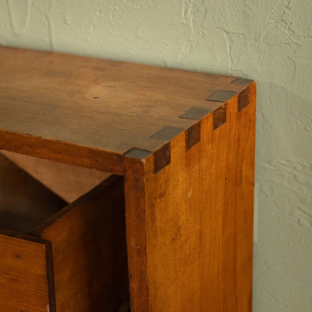 Condition: This cabinet shows clear signs of age and use consistent with its period. The slats display scratches and a few very small holes. The set of four drawers functions properly; one drawer has damage to the front, and another has an old repair that makes its front slightly larger than the others. All wheels on the drawers are in tact and function smoothly. The cabinet is in overall functional condition with evident age-related wear.