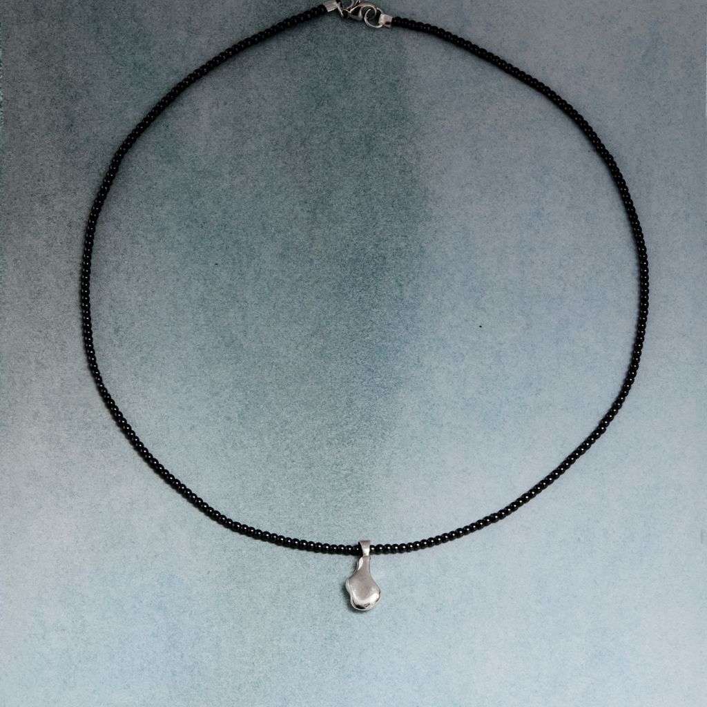 Molten Pebble Choker features a fluid, asymmetrical form cast in solid sterling silver suspended on a strand of hematite beads.