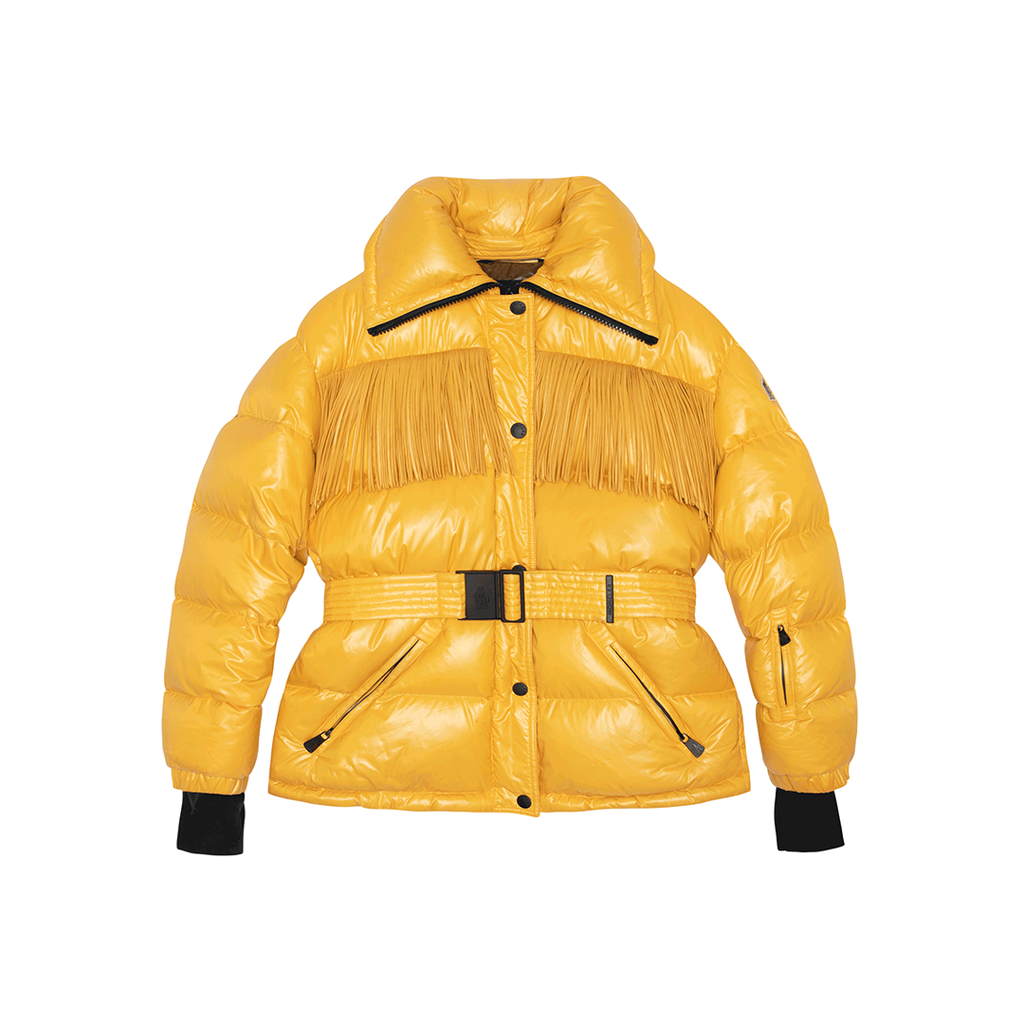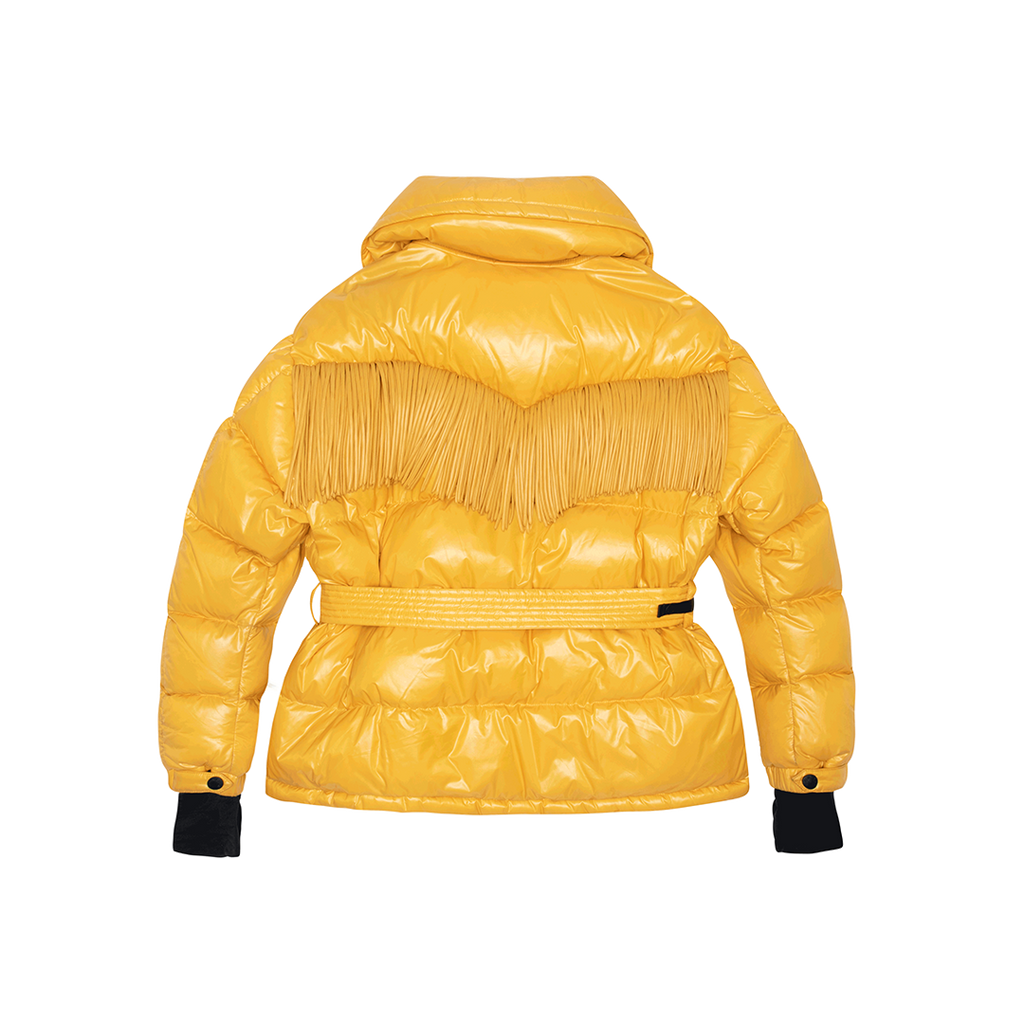 Moncler Genius 2019 Yellow Orbeillaz Fringe Down Jacket features fringe tassel detailling, belt accent at waist, 3 zip pockets, and zip closure at front.