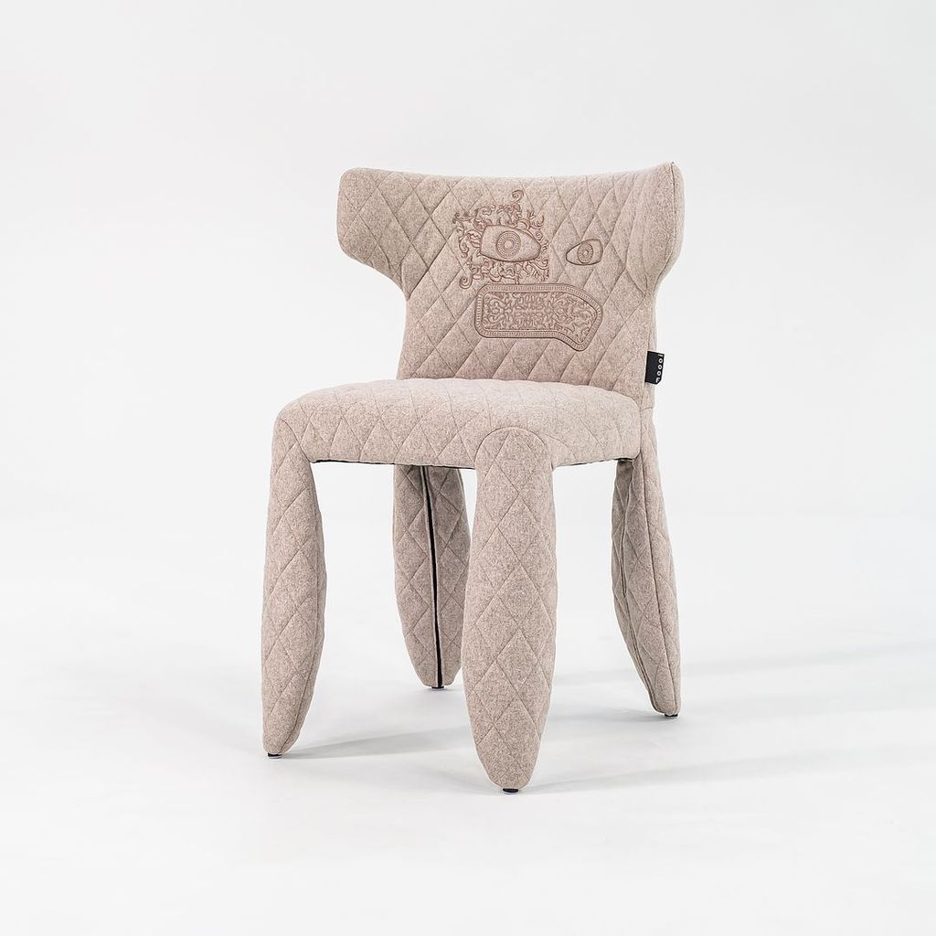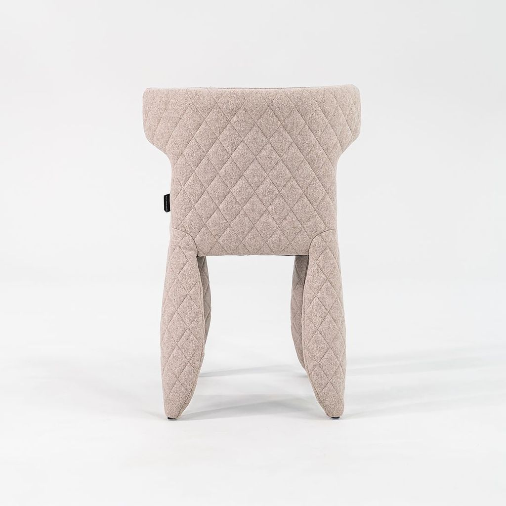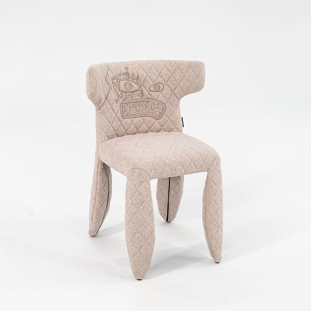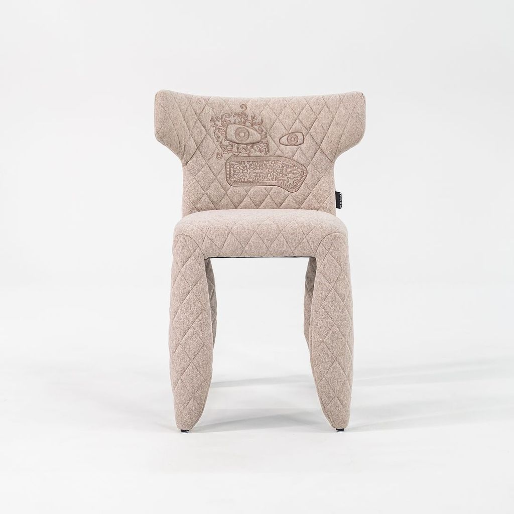 Listed for sale is a single Monster Dining Chair (five are available, though they are priced individually), made with a steel frame and embroidered beige fabric. The fabric appears to be beige Divina Melange by Kvadrat. The chair was designed by Marcel Wanders and produced by Moooi in the Netherlands. It dates to circa 2022 and is guaranteed as authentic. Condition is very good to excellent. See photos.