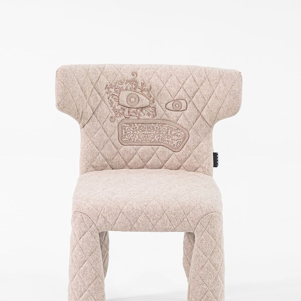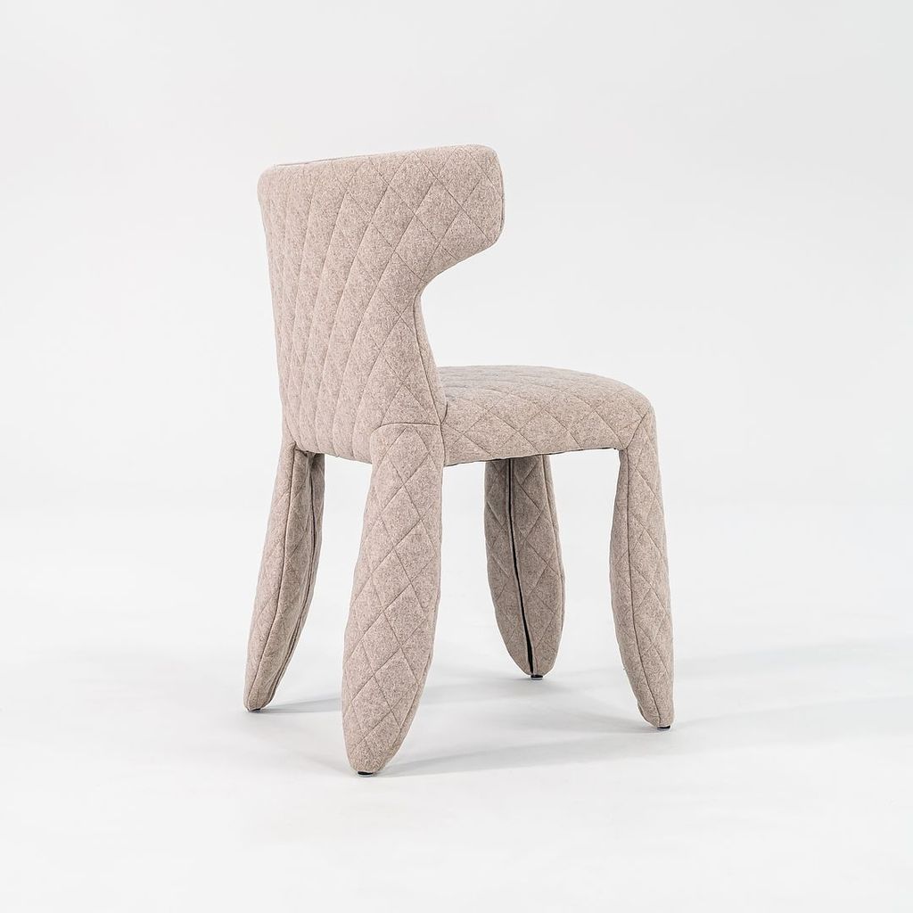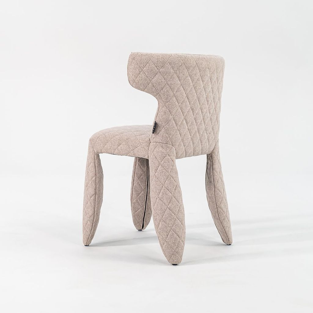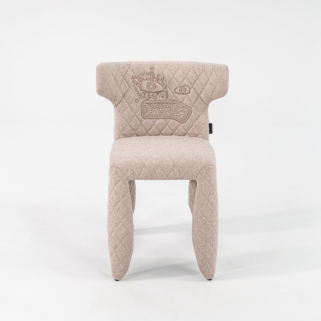 Listed for sale is a single Monster Dining Chair (five are available, though they are priced individually), made with a steel frame and embroidered beige fabric. The fabric appears to be beige Divina Melange by Kvadrat. The chair was designed by Marcel Wanders and produced by Moooi in the Netherlands. It dates to circa 2022 and is guaranteed as authentic. Condition is very good to excellent. See photos.