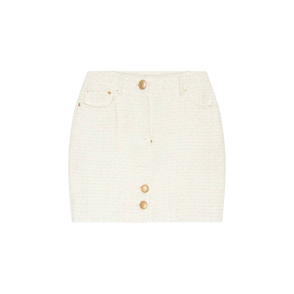 Moschino Couture White Tweed Mini Skirt features front zip closure, gold button detailing, and 4 pocket styling.