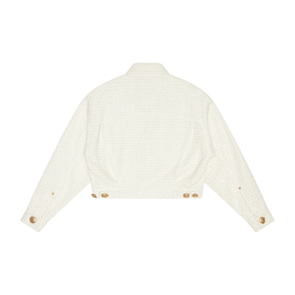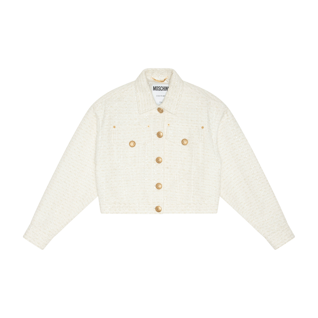 Moschino Couture White Tweed Jacket features gold buttons, 2 front pockets, and cropped fit.