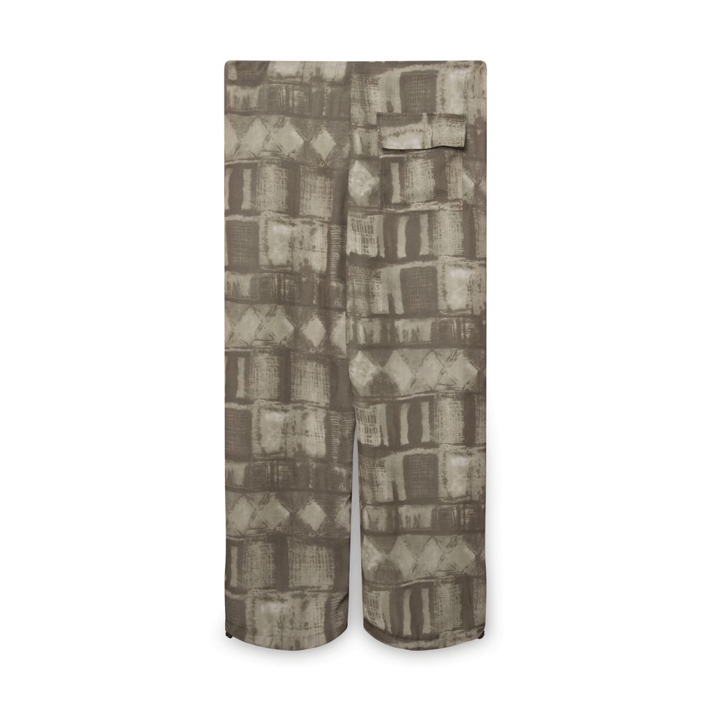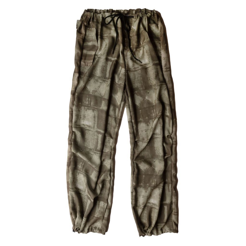 MOSS Camo Pant is a printed crepe track pant featuring adjustable waist and ankle straps and an oversize fit. One Size Fits Most.