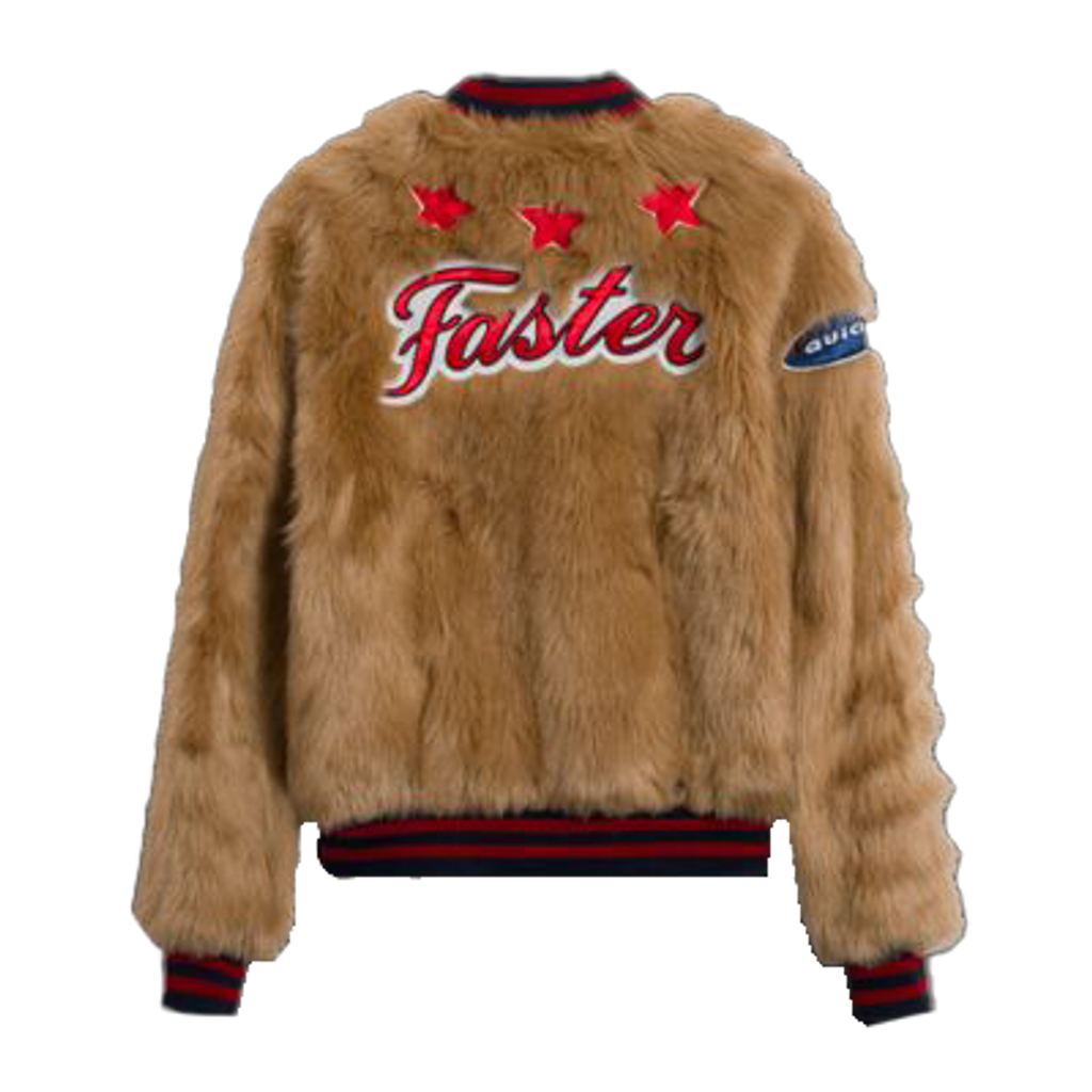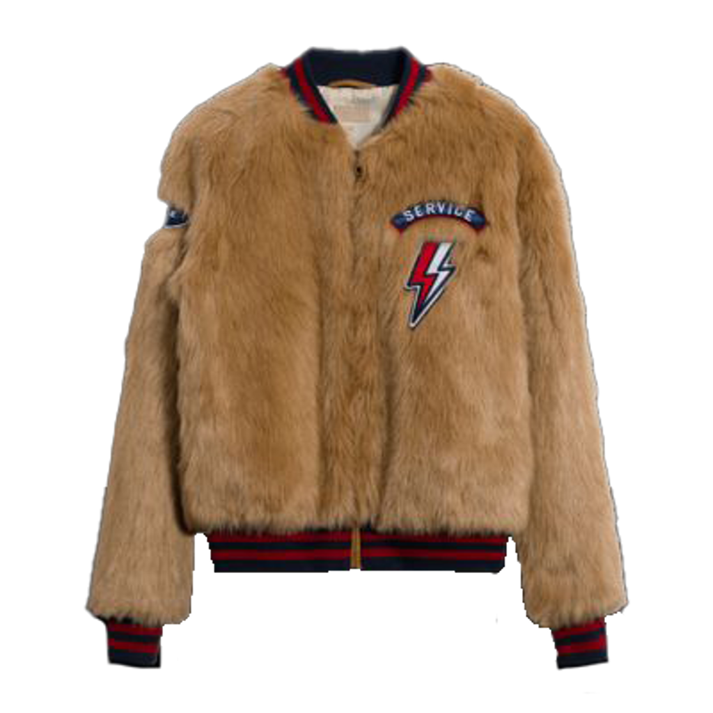 This faux fur bomber jacket features a soft faux fur outer, ribbed collar, functional front zip closure, side pockets, and patch details at the arm, chest, and back. Gently worn, in amazing condition, fully lined inside.