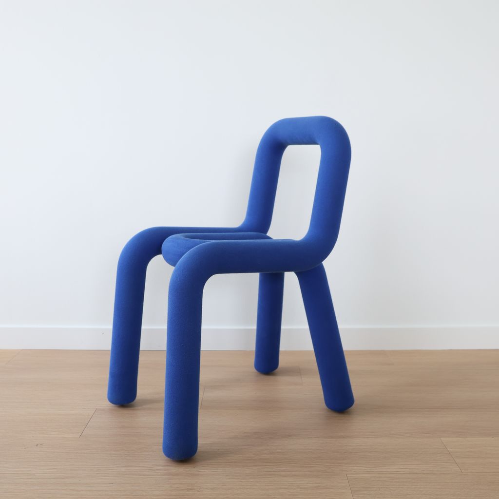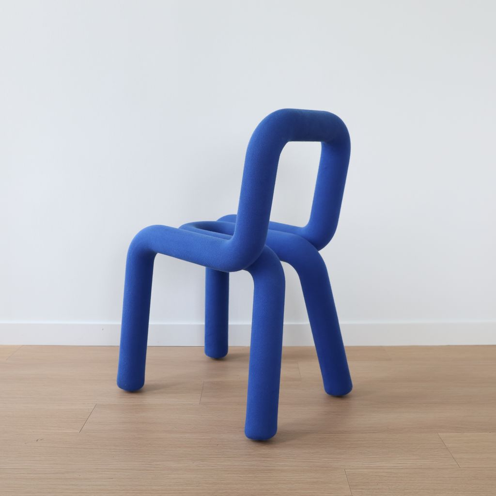 Made up of two tubular parts in metal embedded in each other, the Bold chair is an updated version of the tradition of a bended chair in tubular steel. Inflated with a thin polyurethane foam, the line drawn by the Bold successfully plays the role of foot, seat then back and gives it an amazing level of comfort. With a single stroke, in the manner of the Osvaldo Cavandoli Linea, and thickened similarly to the font which is made bold, the Bold chair succeeds in doing away with the seat and back. Covered with a removable textile coating, the Bold chair can change colour.