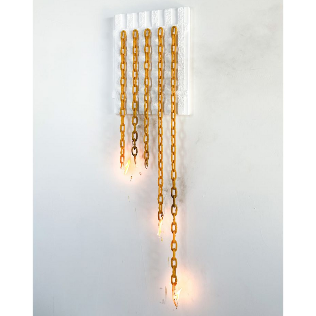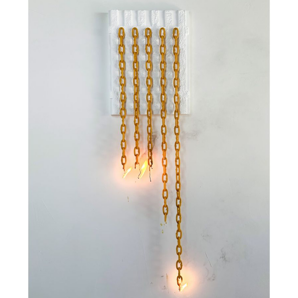 Flashé, beeswax, molding paste, hemp on birch panel.