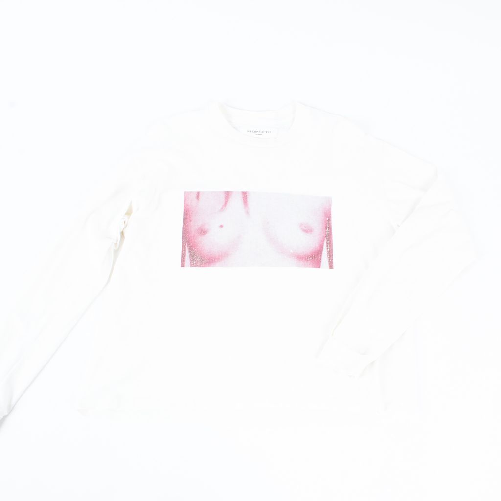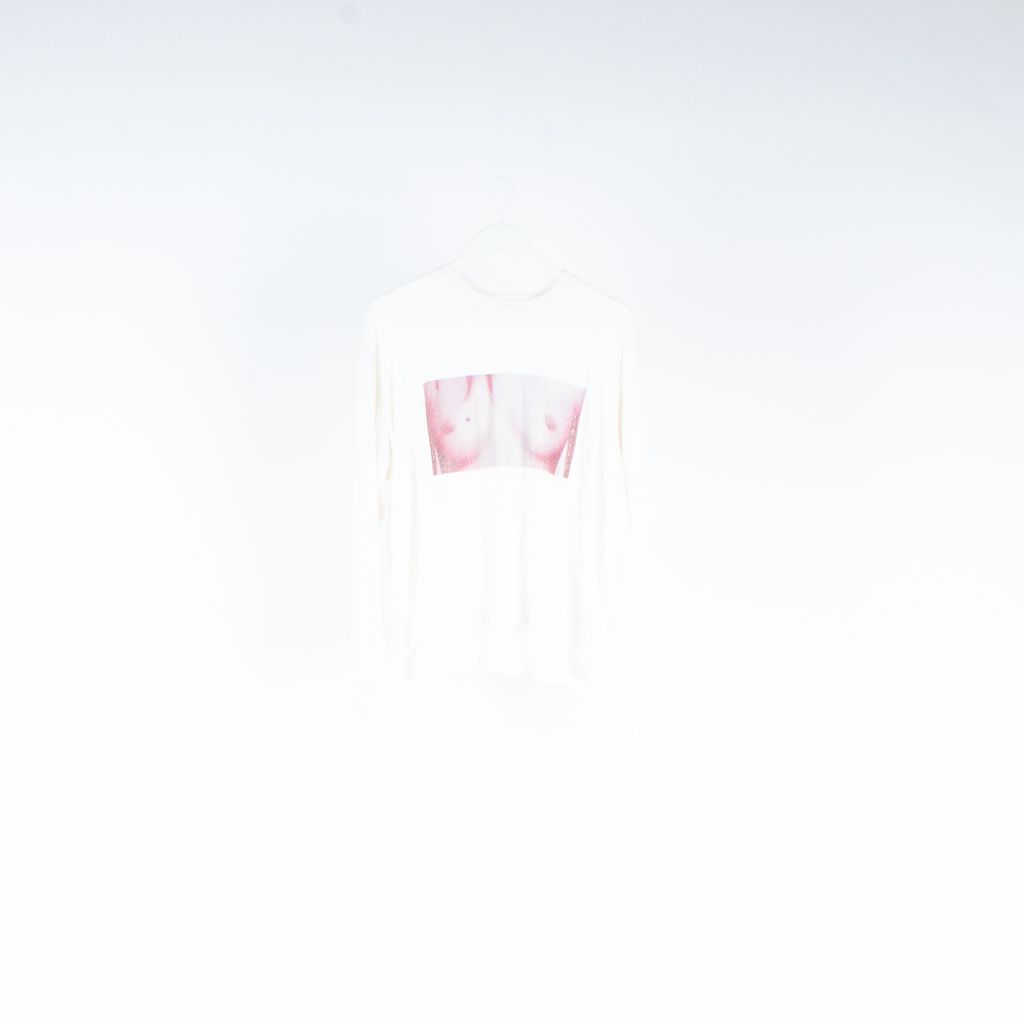 Reminiscent of Vivienne Westwood's Tits shirt, this long sleeve from Mr. Completely's Kate Moss tribute collection is a new spin on an old favorite. Features rib knit bands at neck and wrists as well as intentionally faded "see through" chest graphic.