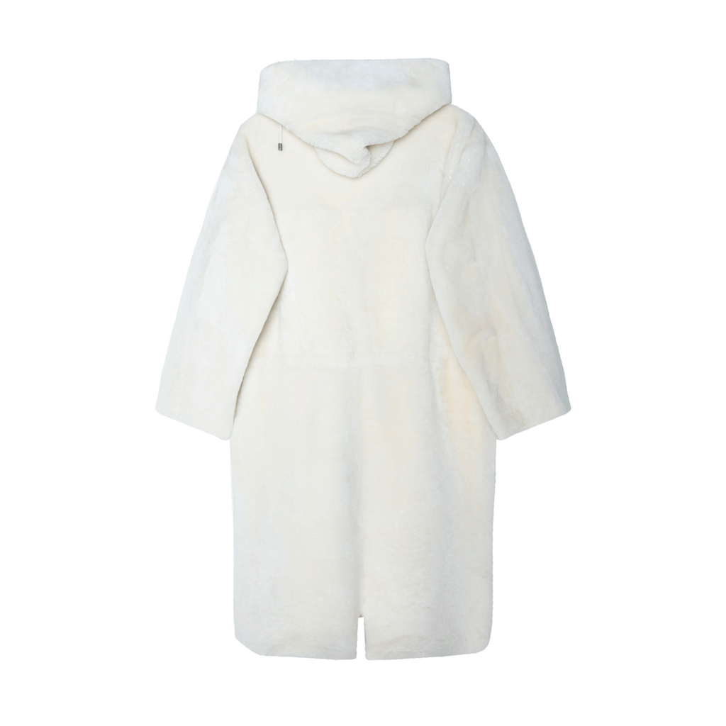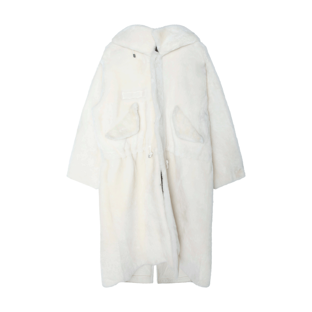 Mr & Mrs Italy White Hooded Long Fur Coat features drawstrings on hood, concealed front zip closure, drawstring at waist, and 2 front pockets.