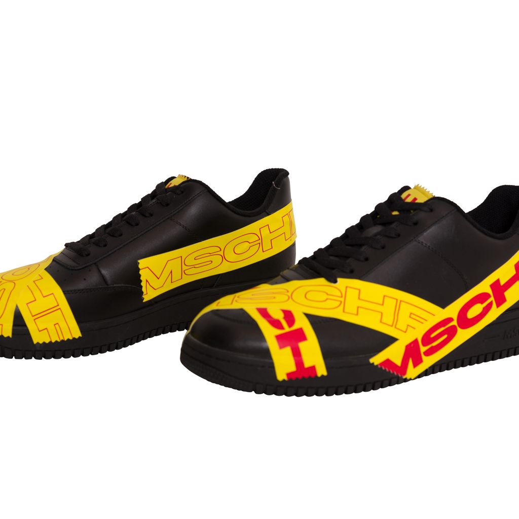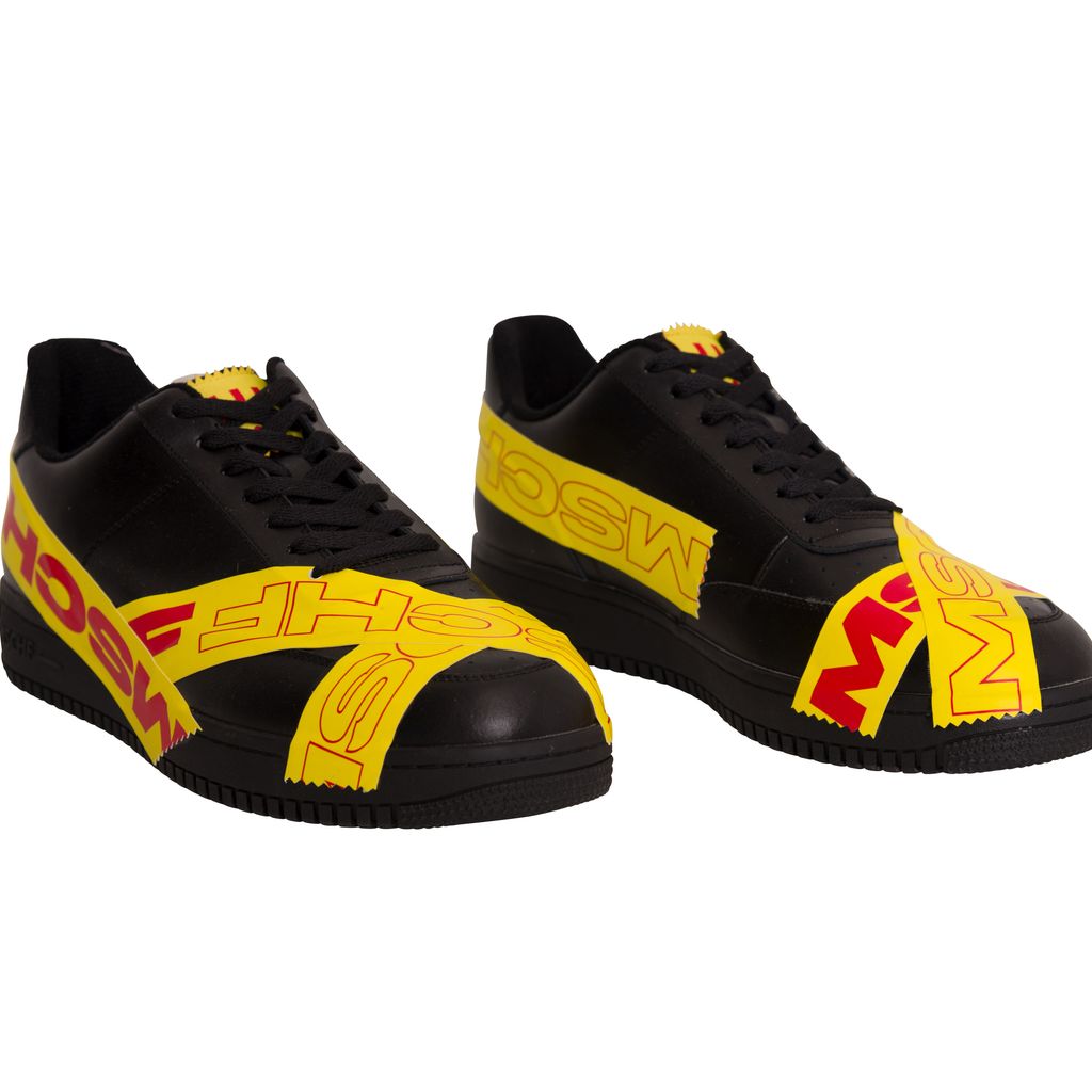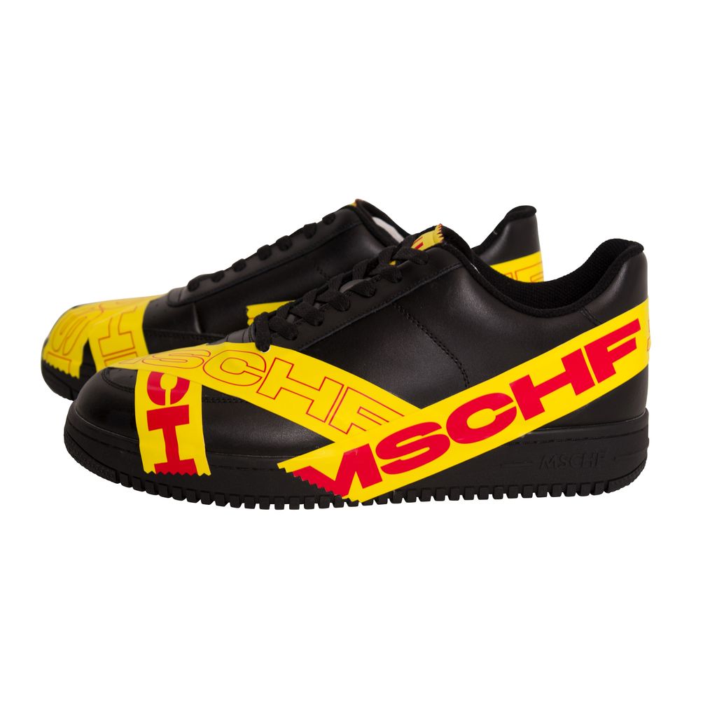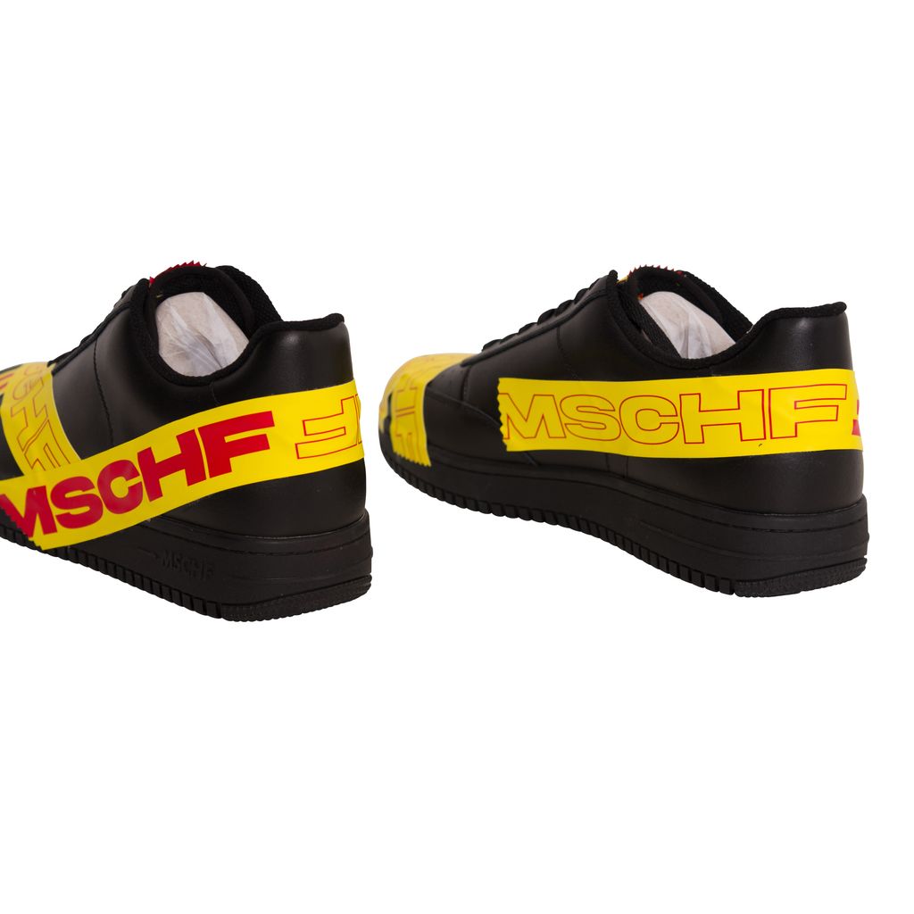 MSCHF TAP3 features all black shoe with yellow and red 'tape' design.