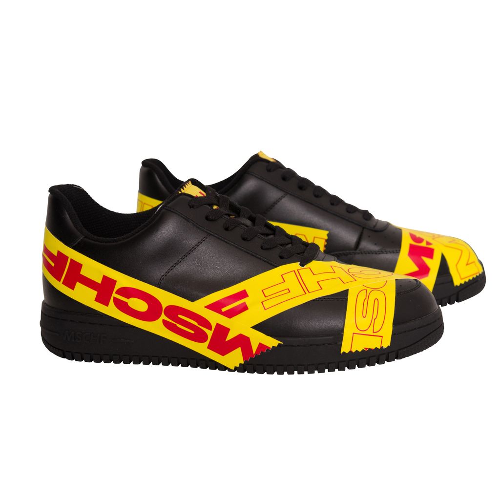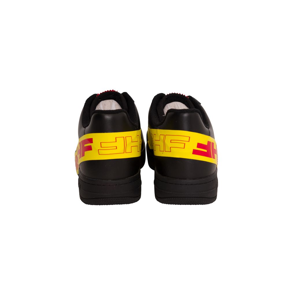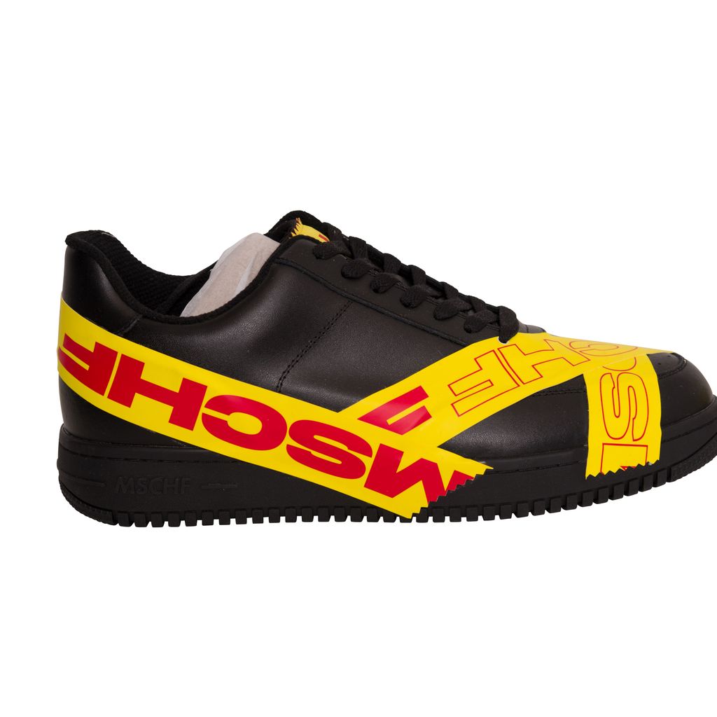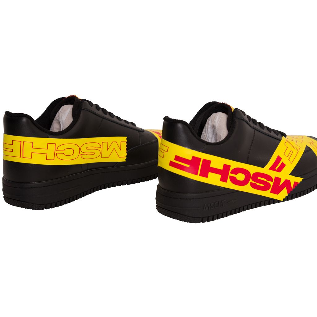 MSCHF TAP3 features all black shoe with yellow and red 'tape' design.