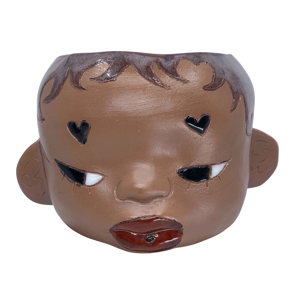 Mug 14 by Sydnie Jimenez are custom, handmade ceramic mugs inspired by the representation of black and brown youth and self-expression as a form of protest and care to protect against a Eurocentric society founded on white supremacy and colonization.