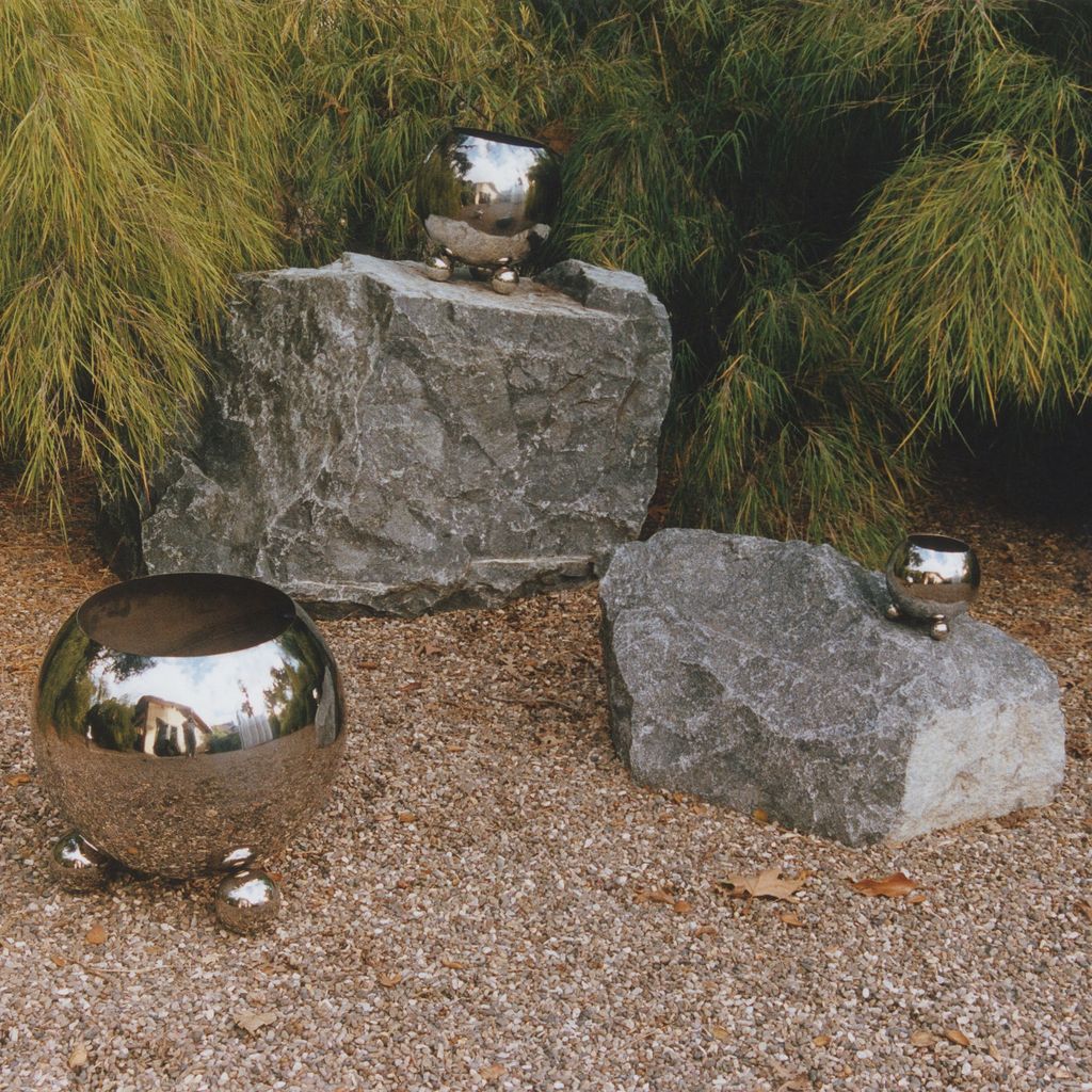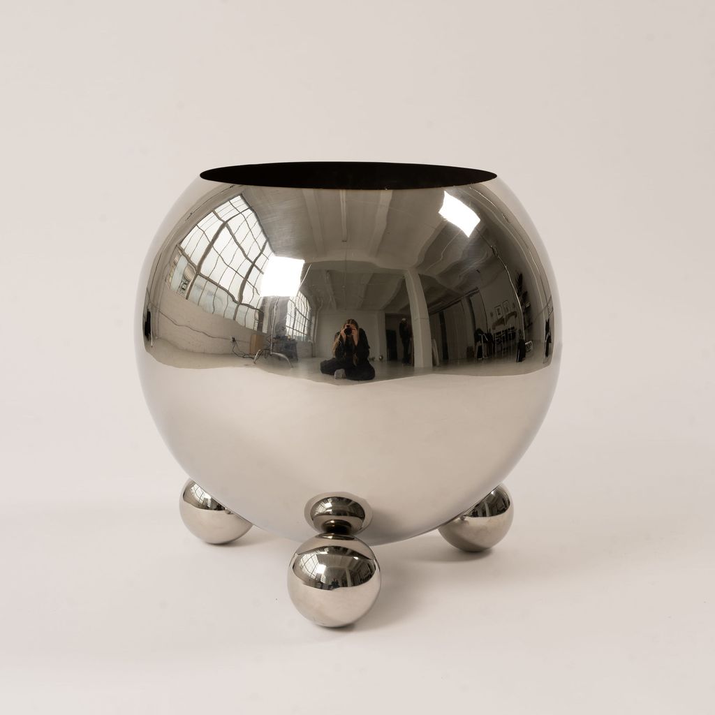 The Selene Planter is made of hand-spun stainless steel and is suitable for indoor and outdoor use. The planter is pre-drilled with three drain holes.