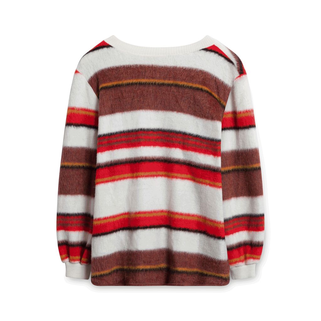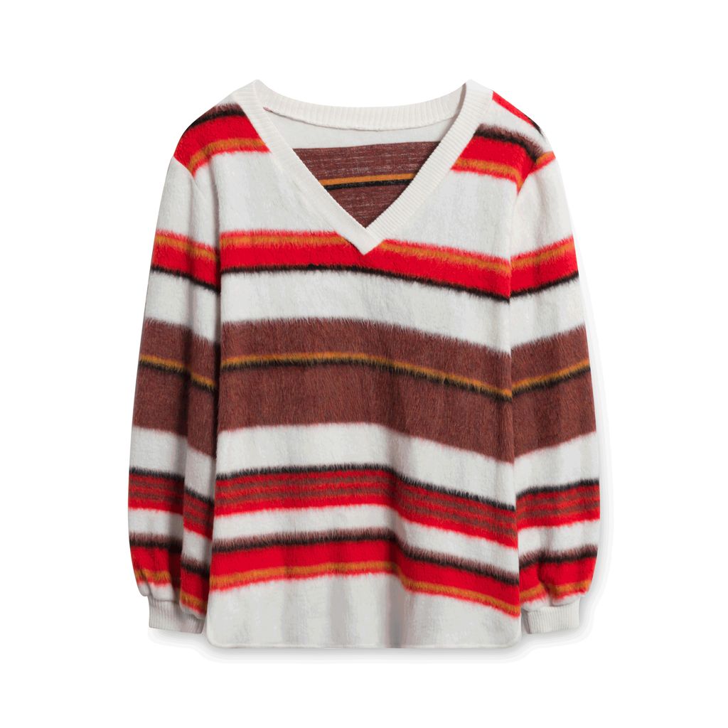 The oversized stripes and varsity-inspired finishing make this a truly nostalgic piece to add to your closet. This knit promises comfort with its fuzzy texture and loose v-neck silhouette.