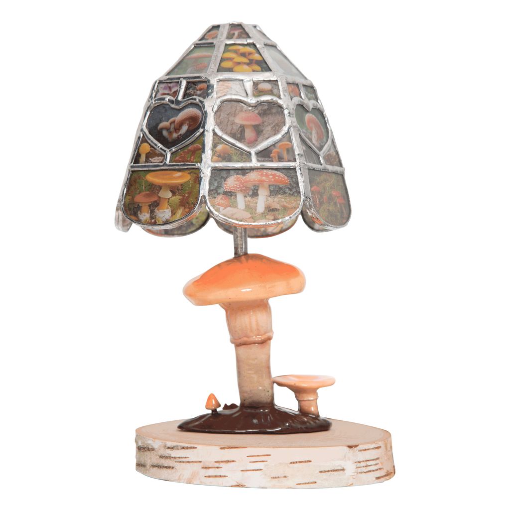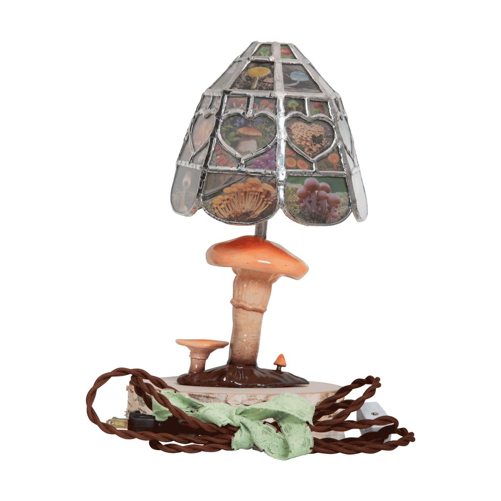 Acrylic and clear-coat lacquer on 3D printed PLA plastic, glass, inkjet print on vellum, solder, twisted lamp cord, nickel plated lamp harp, inline cord switch