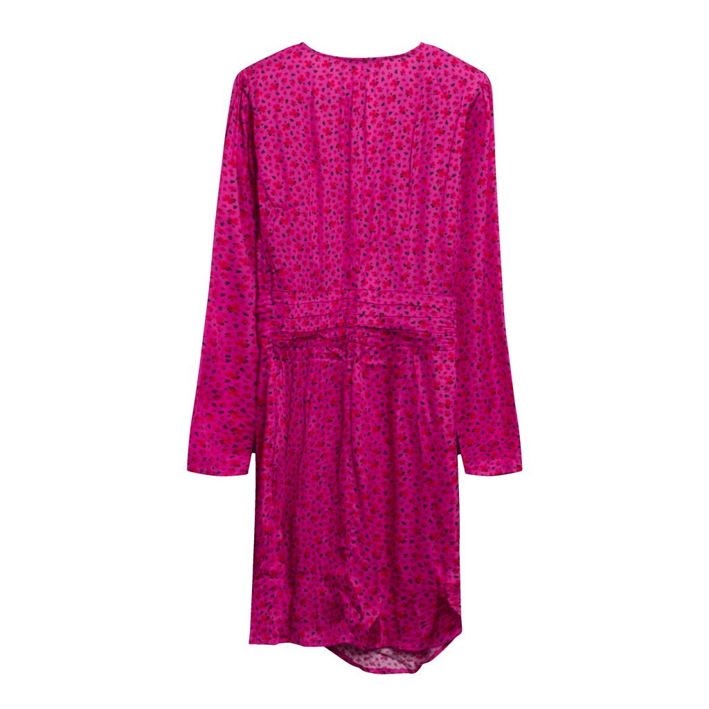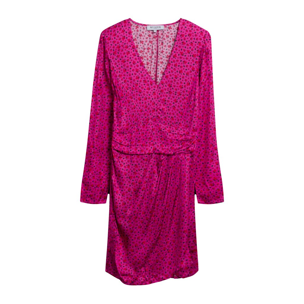 This dress from Musier Paris is loaded with details to keep all eyes on you no matter where you go. Features all over pink clover print fabrication, padded shoulders, pleated waist panel, deep V-neck shape, wrap skirt with overlap closure on left side, long sleeves, and side zip closure.