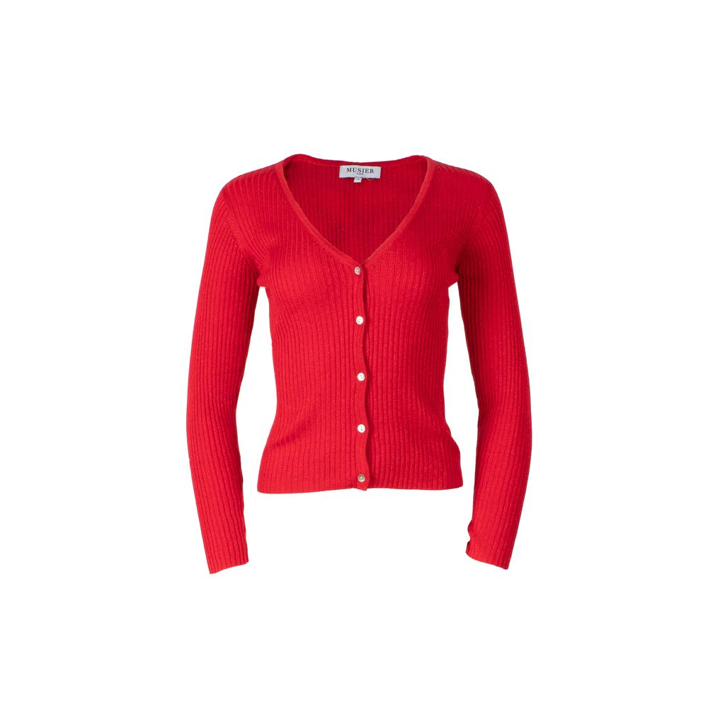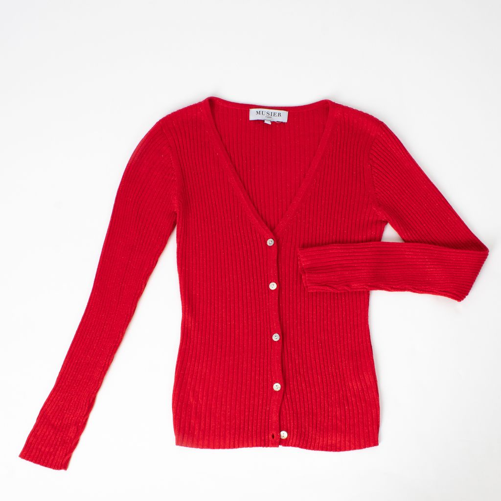 Whether you have disco fever or holiday dream, this metallic cardigan from Musier Paris is the piece for you. Features metallic knit fabrication, rib knit body, small tonal buttons for front closure, and deep V-neck shape.