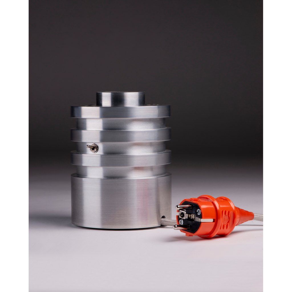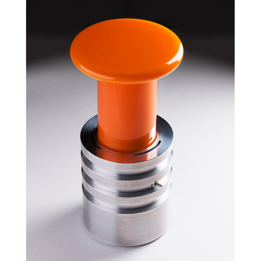The verrine which surmounts the raw aluminum base is a unique hand-blown piece. A lever switch allows you to vary the intensity of the light. The production is carried out in France with the Studio's partners.