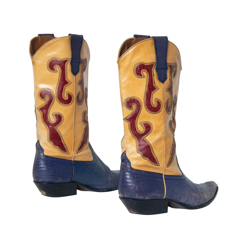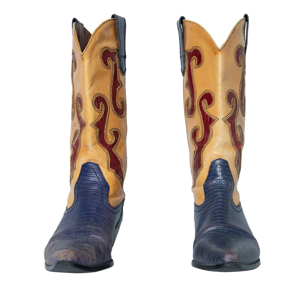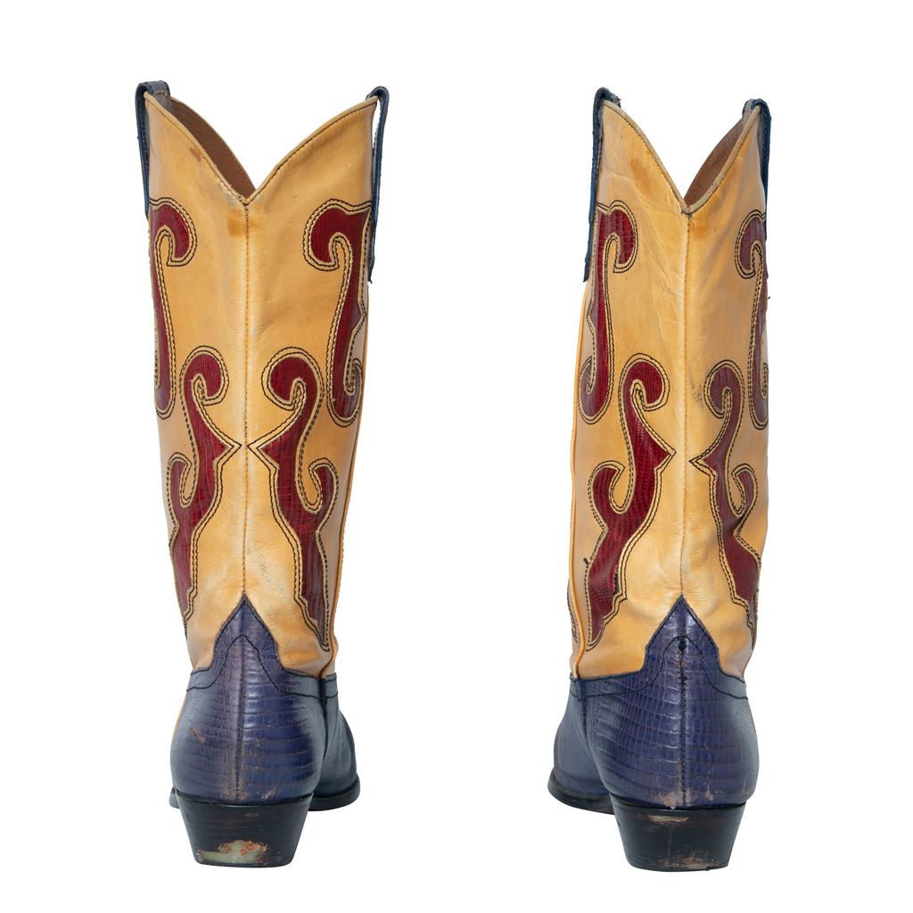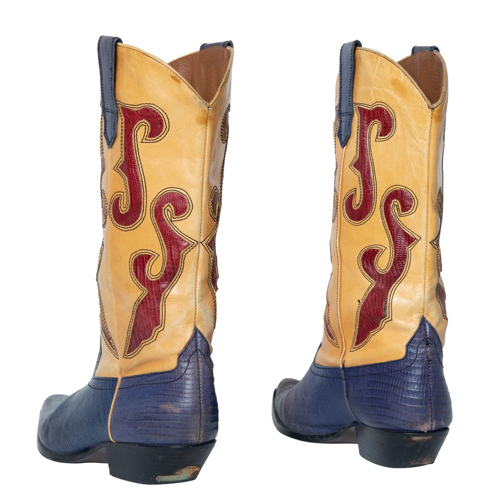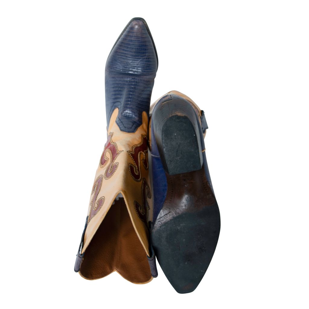 N-Ronnee Cowboy Boots features color blocking details, snakeskin print on blue and red, and pointed toe.
