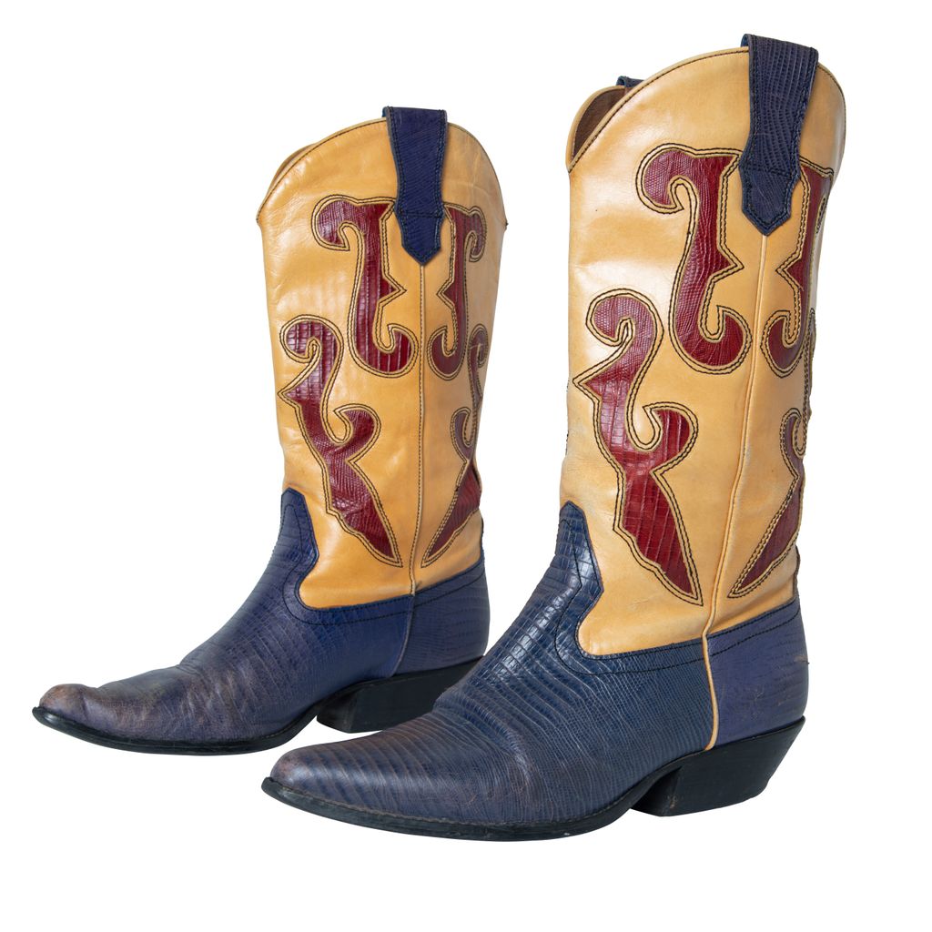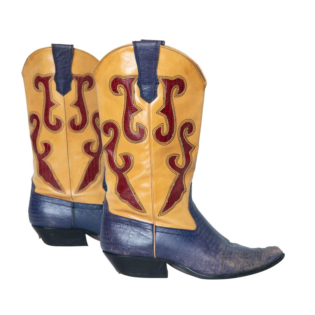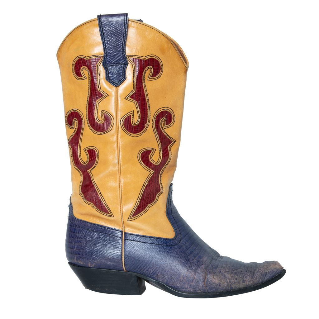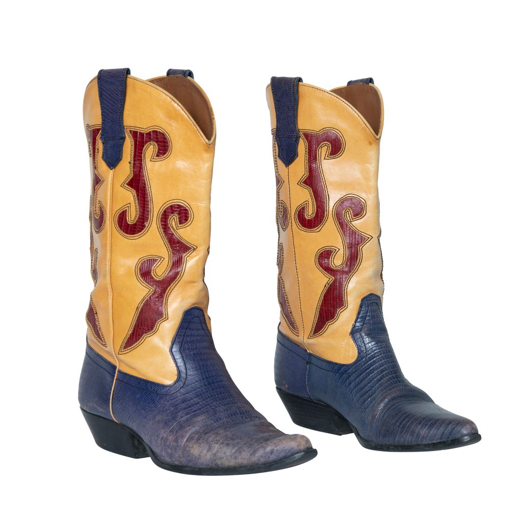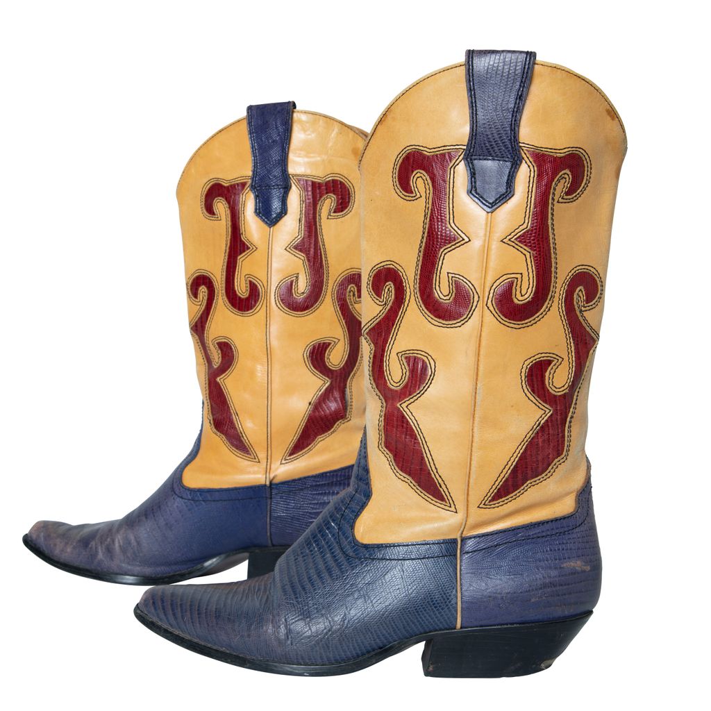 N-Ronnee Cowboy Boots features color blocking details, snakeskin print on blue and red, and pointed toe.