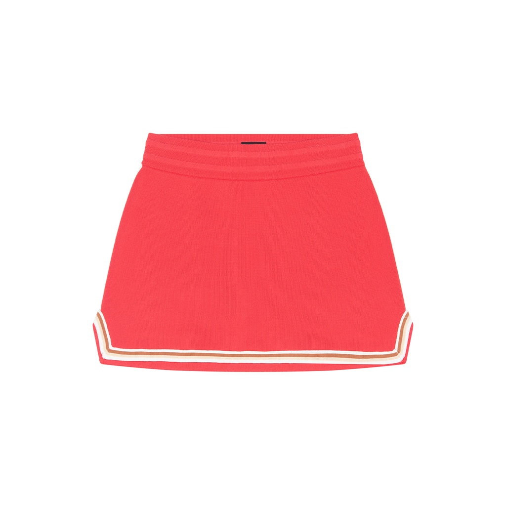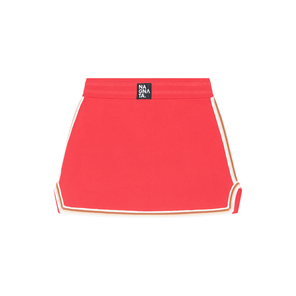 Nagnata Red Motley Mini Skirt features organic cotton tech-knit fabrication, custom knitted tape, mini V at hemline, elasticated waist, and brown striped hem.