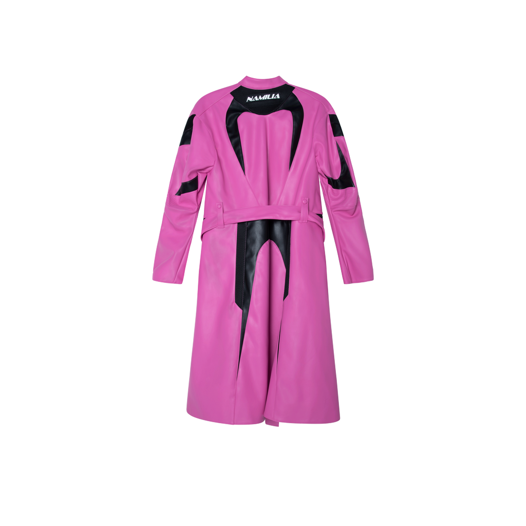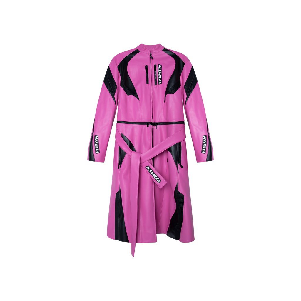 Namilia Pink Transformer Moto Coat features detachable waist zip design, vegan leather construction, 3D rubber logo tags, detachable tie belt, high neckline, and front zip closure.