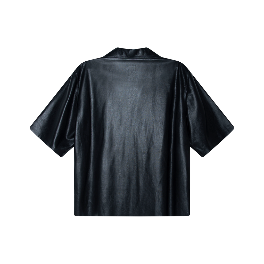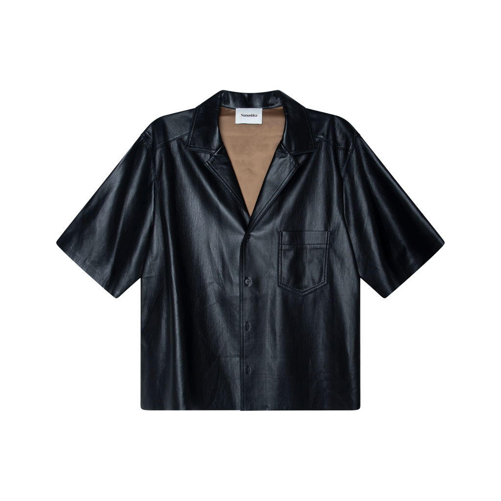 Nanushka Bodil Black Okobor Shirt features front button closure, Okobor alternative leather, boxy fit, and front pocket.