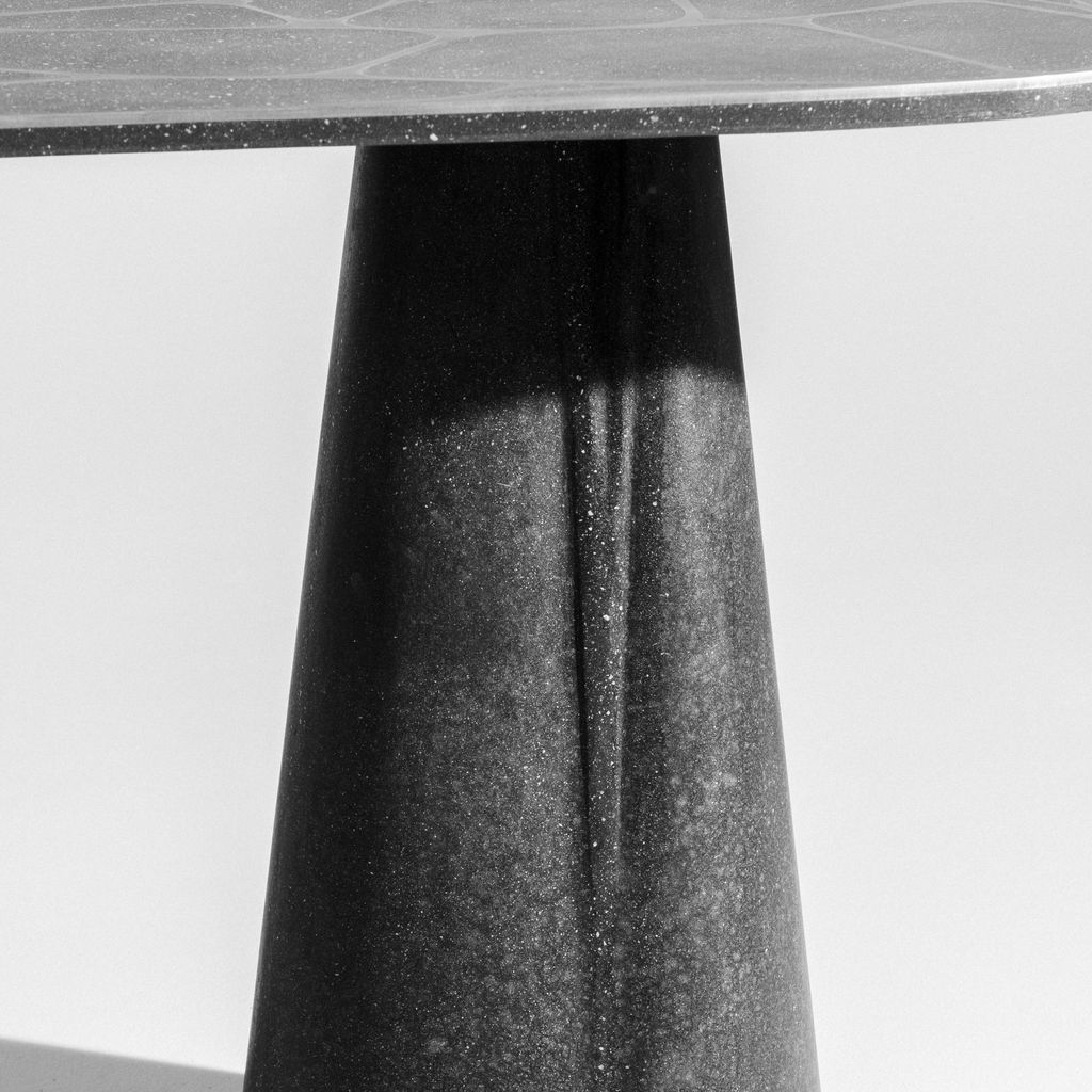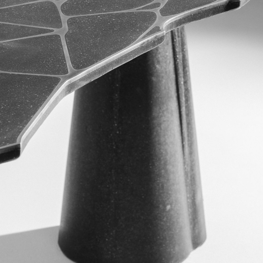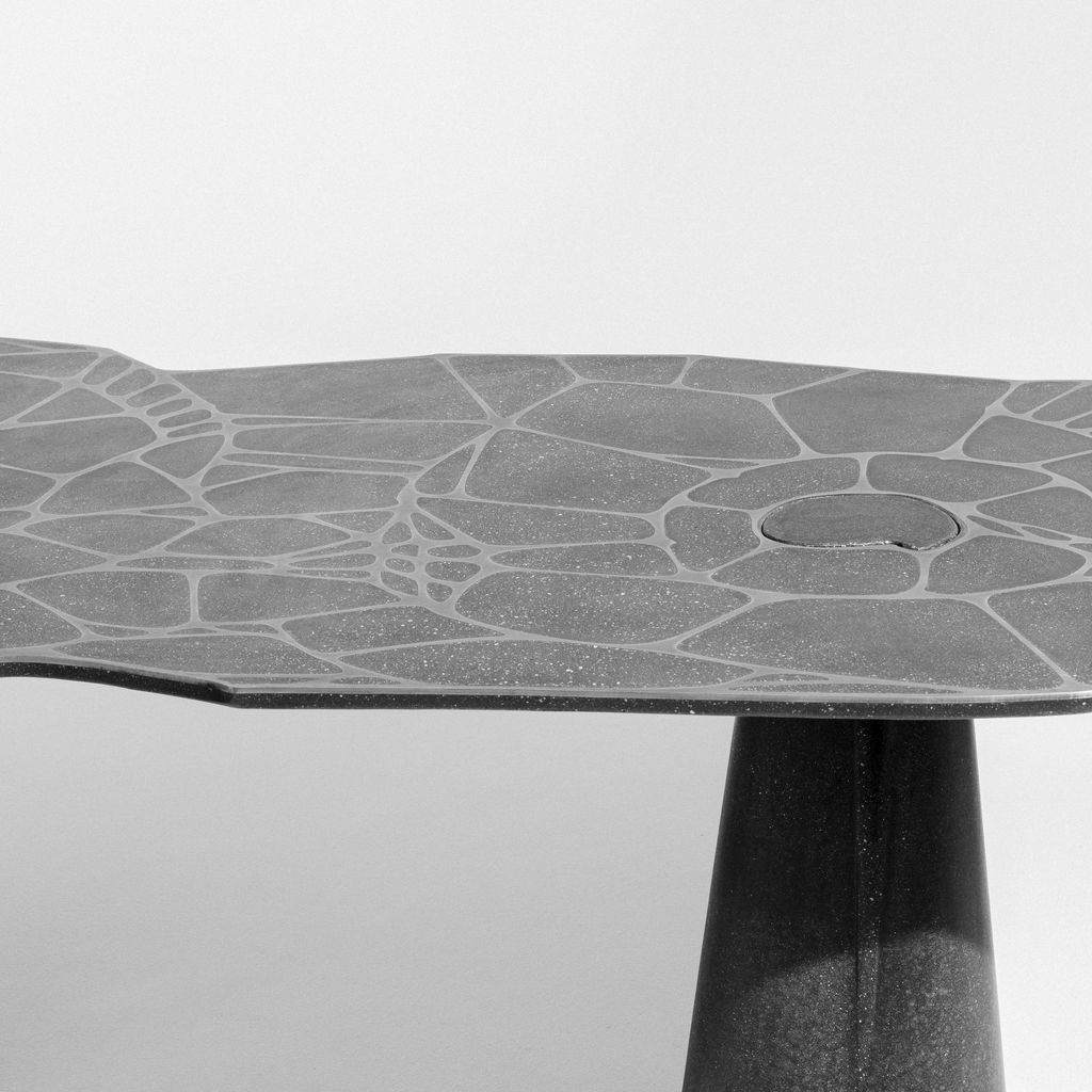 "The design is based on the skeletons of Radiolaria which are microscopic organisms found on the ocean floor. The outer edge of the table meanders in an organic way rather than staying in a rigid circle. The leg does as well. In this way we keep the piece human, approachable and fun; rather than adhering to the rigidity of a circle." - James de Wulf.