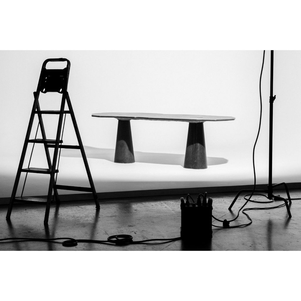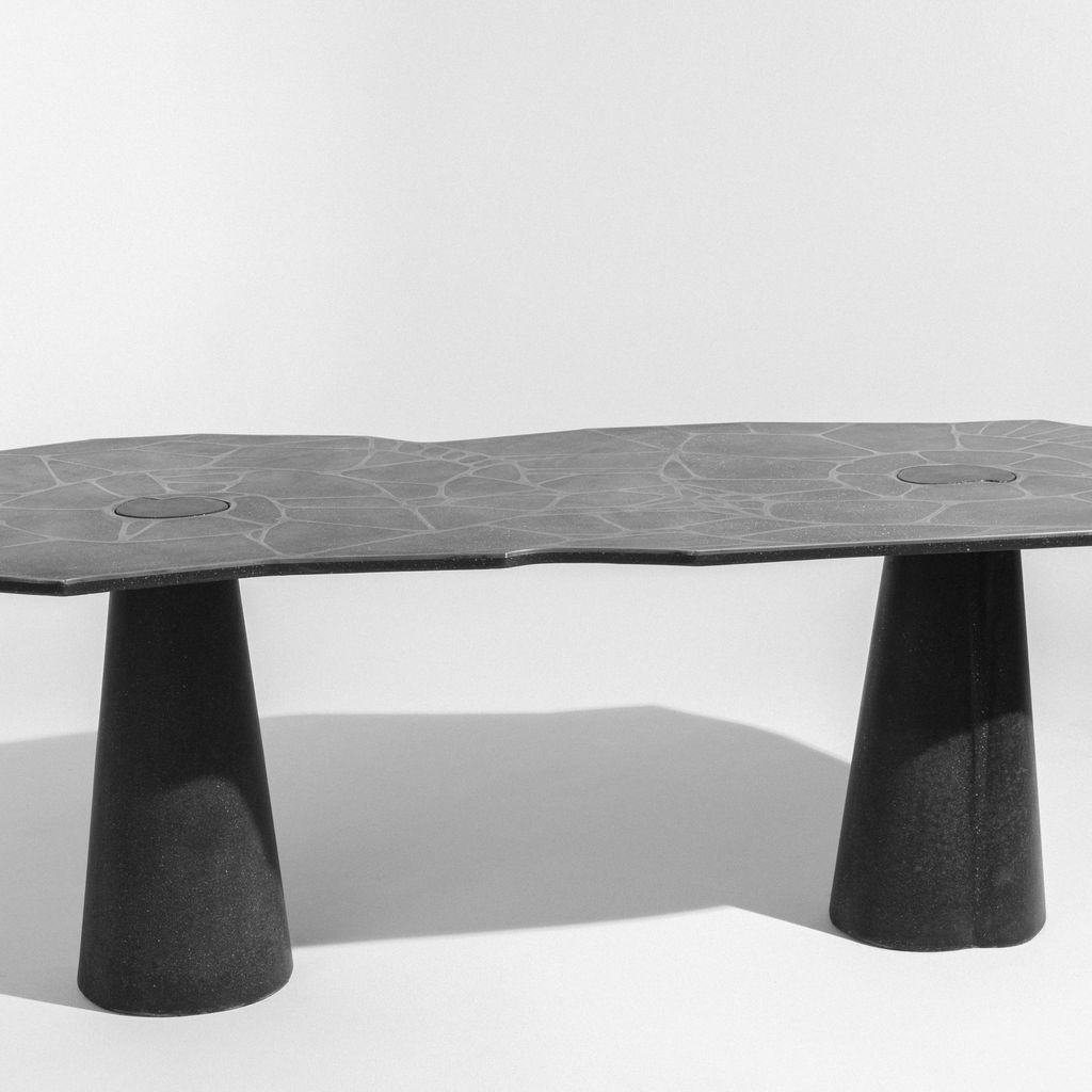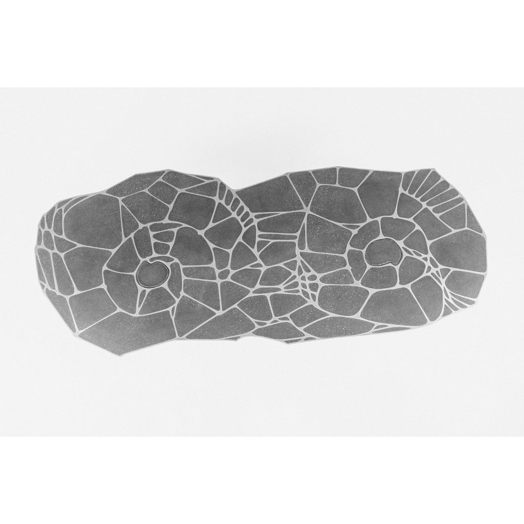 "The design is based on the skeletons of Radiolaria which are microscopic organisms found on the ocean floor. The outer edge of the table meanders in an organic way rather than staying in a rigid circle. The leg does as well. In this way we keep the piece human, approachable and fun; rather than adhering to the rigidity of a circle." - James de Wulf.