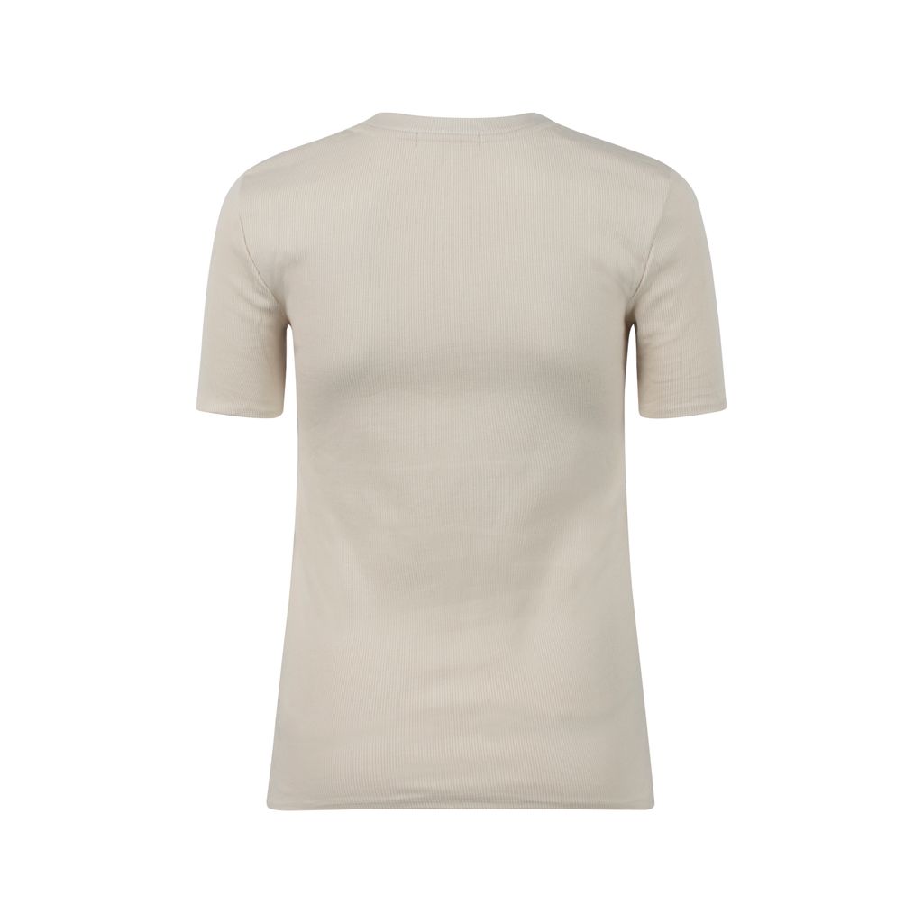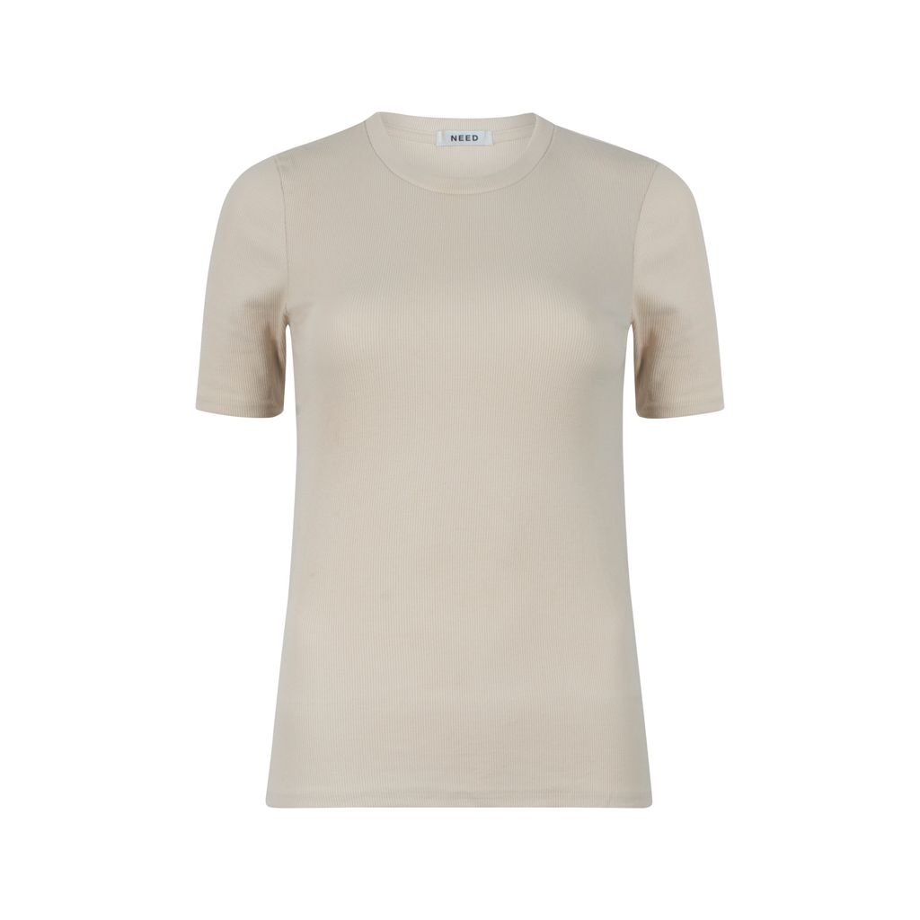 Beige ribbed tee from NEED features a high crew neckline, half sleeves, straight hem, and a slim silhouette. The not so basic, basic your closet needs. Gently worn.