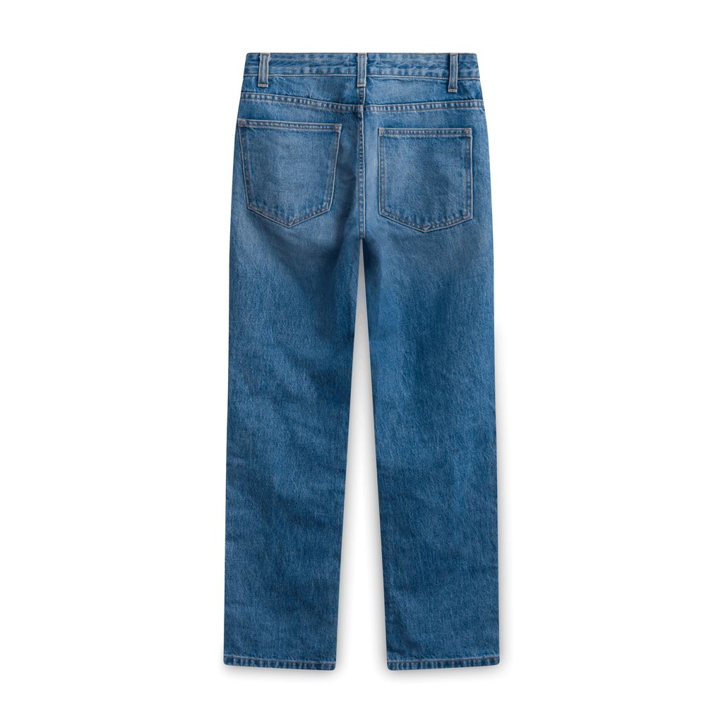 Blue denim jeans with silver hardware and a zipper/button enclosure. Dual functioning pockets on both sides of the jeans.