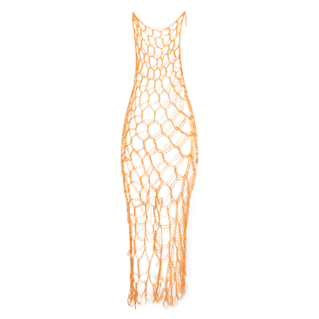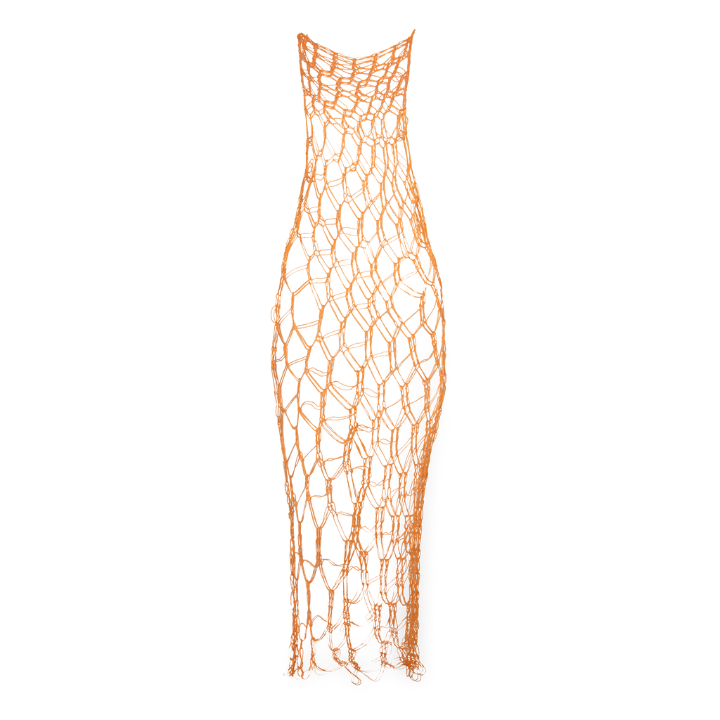 Net Dress - Orange is a hand crocheted mesh dress made with cotton blend. One size, great stretch.