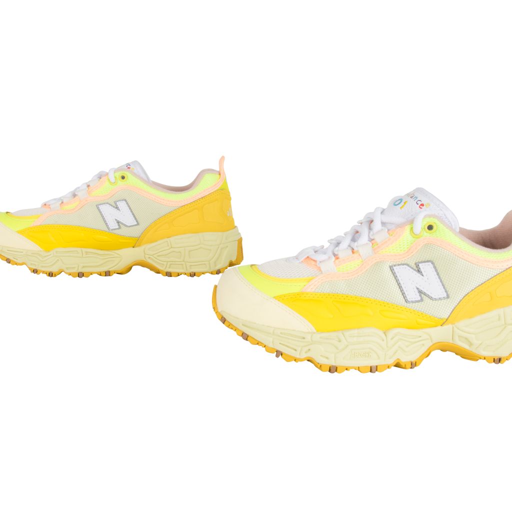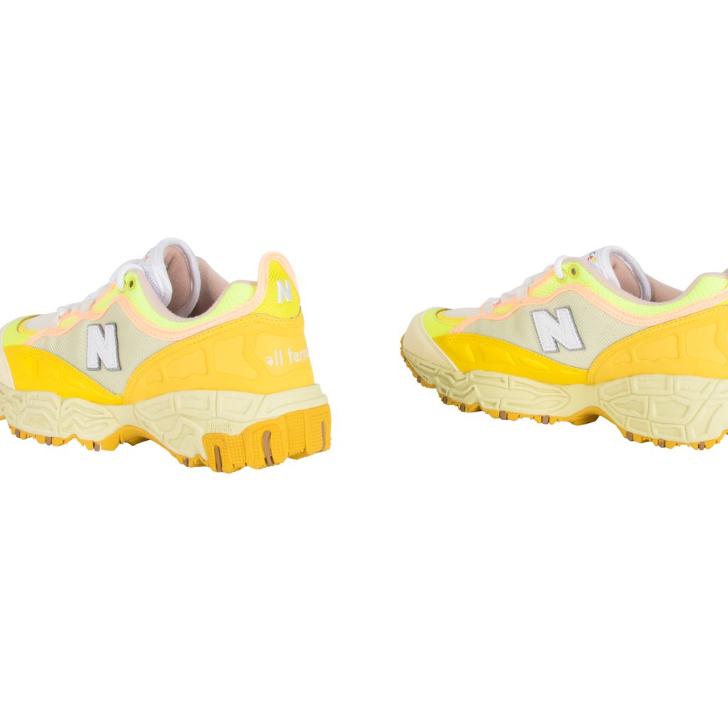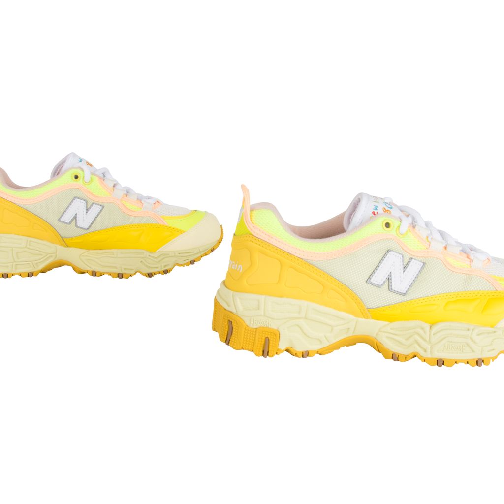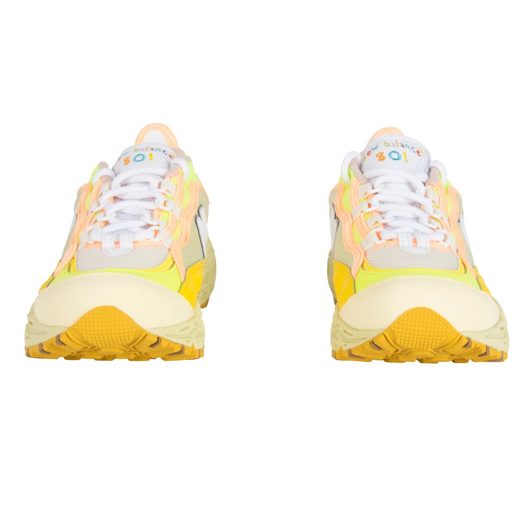 These New Balance Paperboy 801 sneakers in Ginger Lemonade feature a fluorescent upper with a mix of yellow and orange hues with a mustard yellow rubber sole. In excellent condition, no signs of wear.