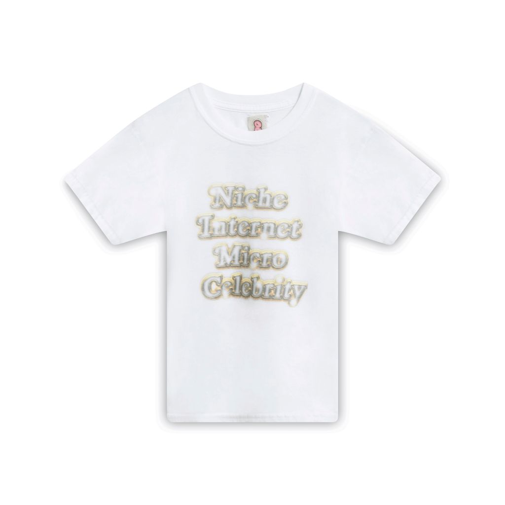 White t-shirt with printed text "Niche Internet Micro Celebrity" on the front.