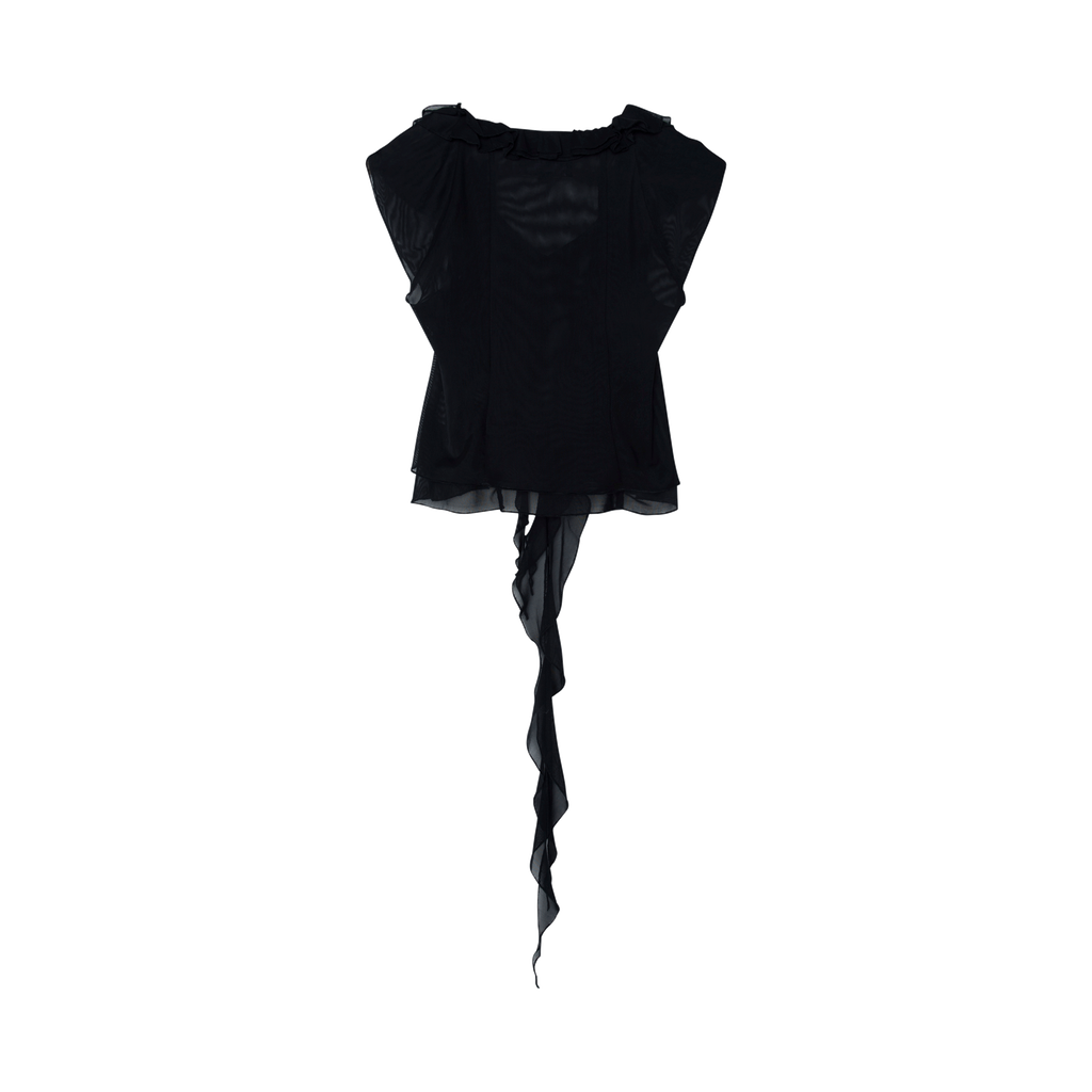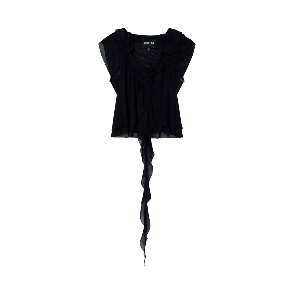 Niihai Black Ruffle Tank features mesh material, ruffle trim and detailing, and V-neck.