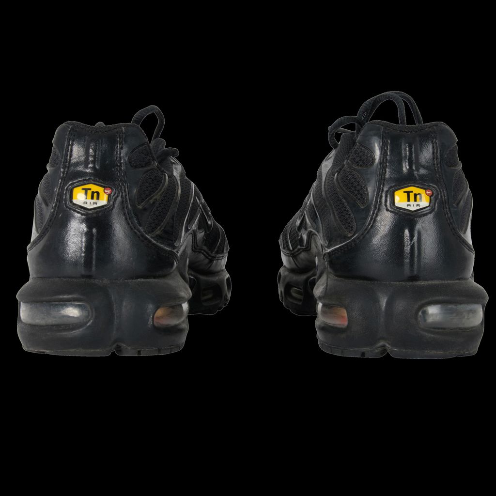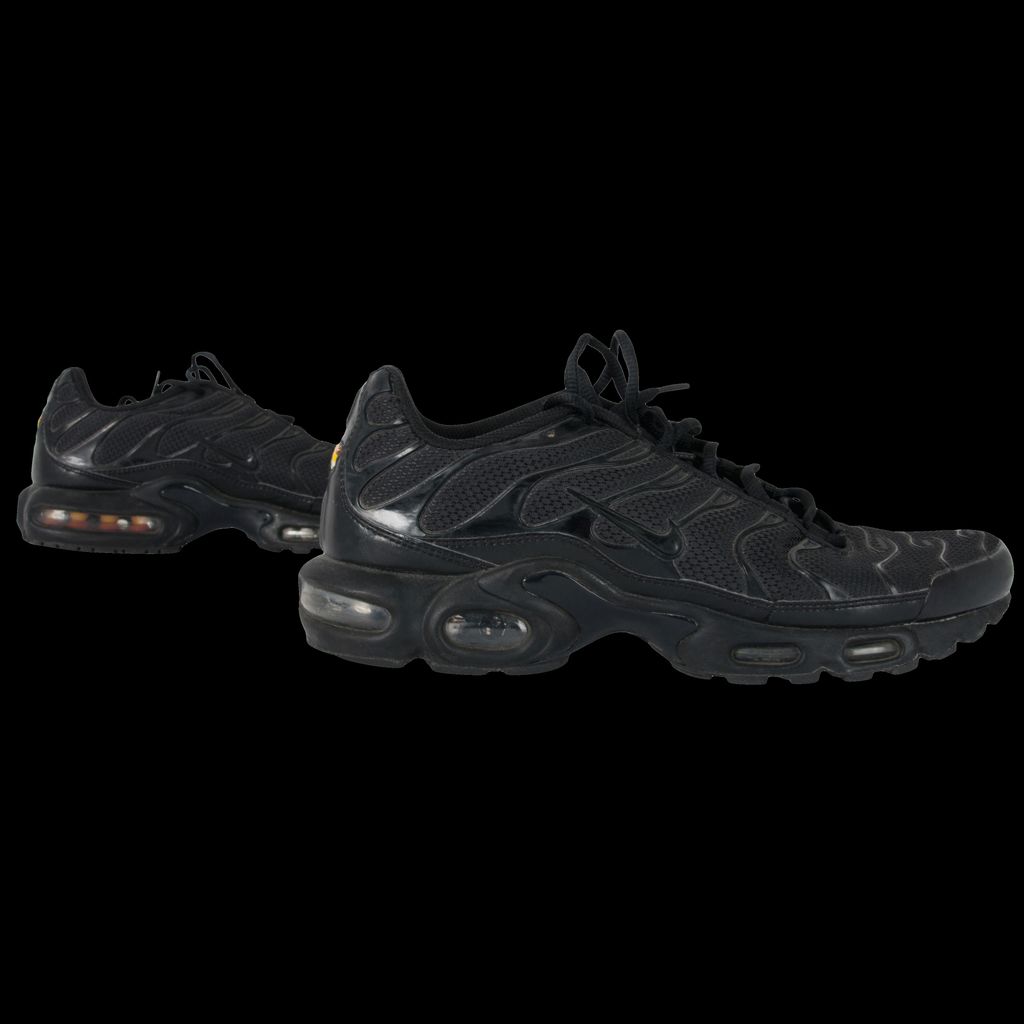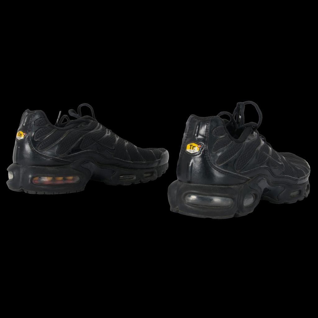 These Nike Air Max Plus in all feature a rubber outsole for durability, stretch synthetic upper for comfort and flexibility. Exposed inner airbag on sole revealing a yellow and red inner mold for extra support at the heel. Gently worn, in good condition, fading and marks on bottom of shoe from previous wear.