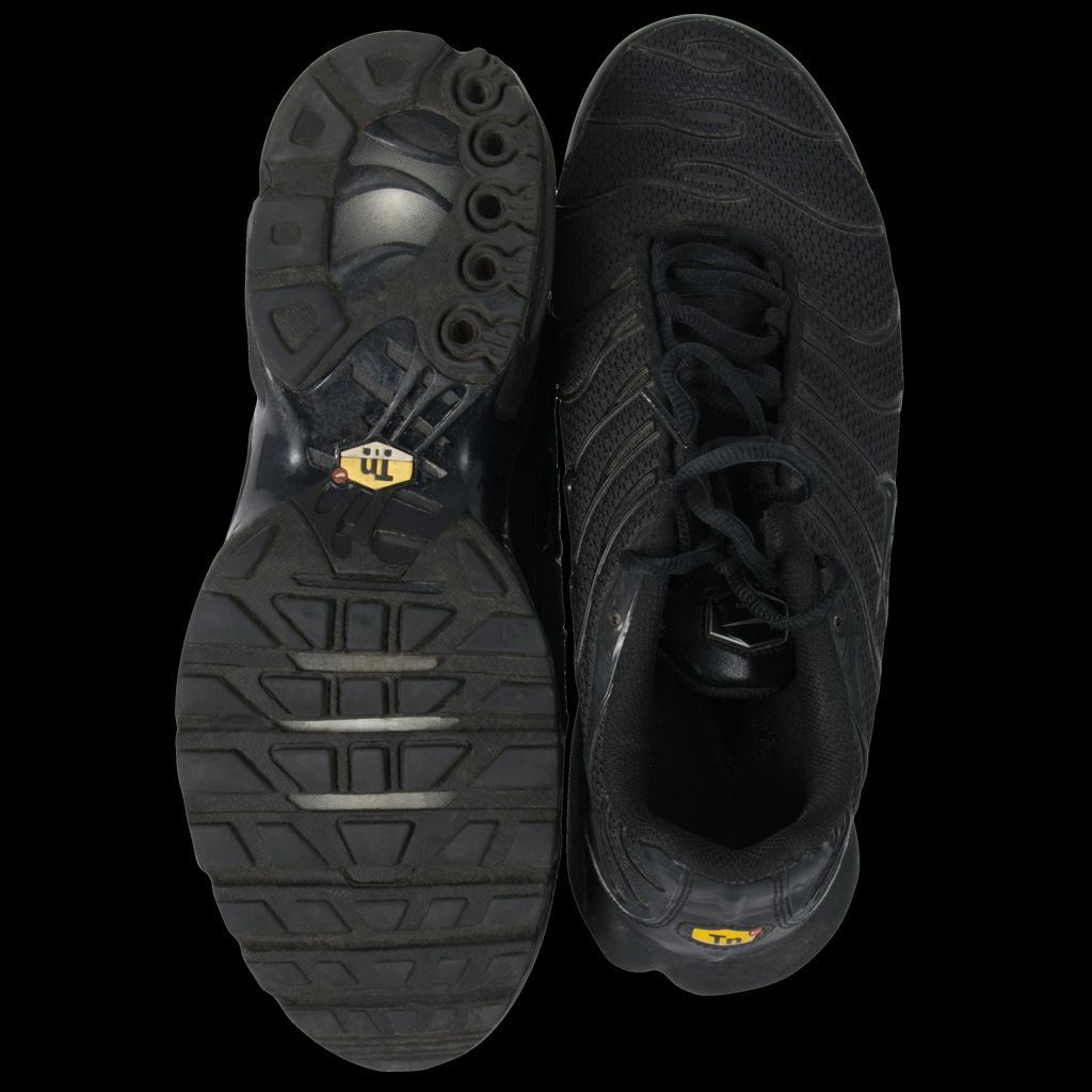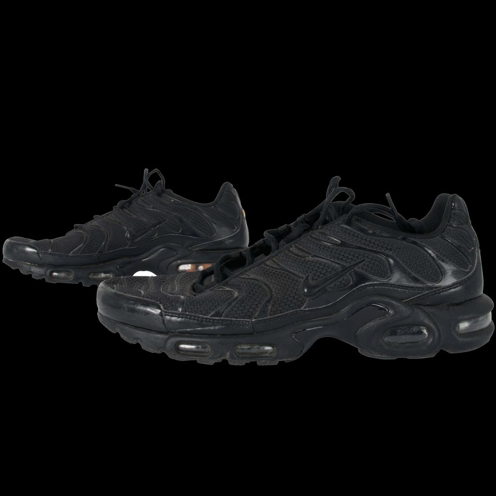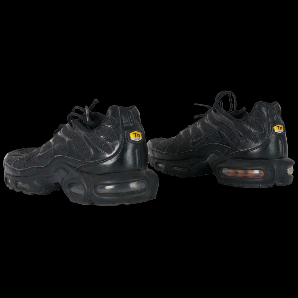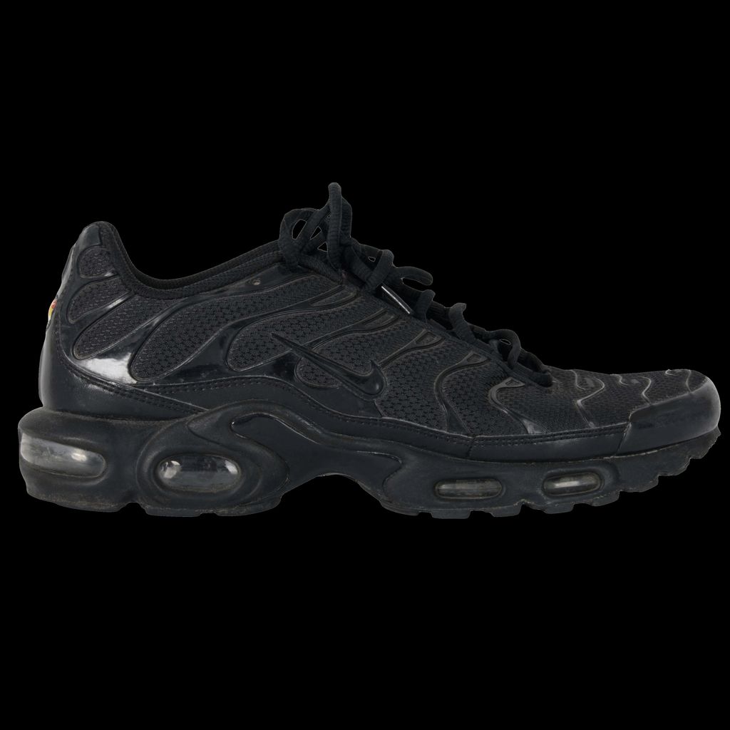These Nike Air Max Plus in all feature a rubber outsole for durability, stretch synthetic upper for comfort and flexibility. Exposed inner airbag on sole revealing a yellow and red inner mold for extra support at the heel. Gently worn, in good condition, fading and marks on bottom of shoe from previous wear.