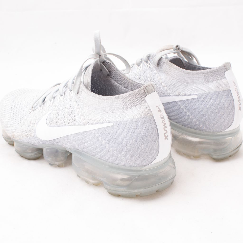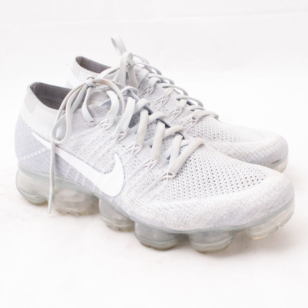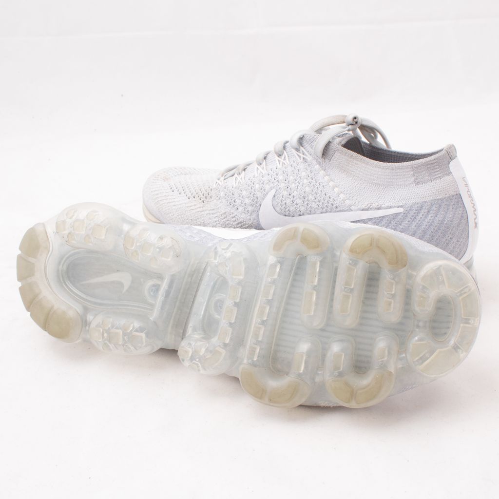 In fair condition, Nike Air Vapormax fly knit in pure platinum white and wolf grey.