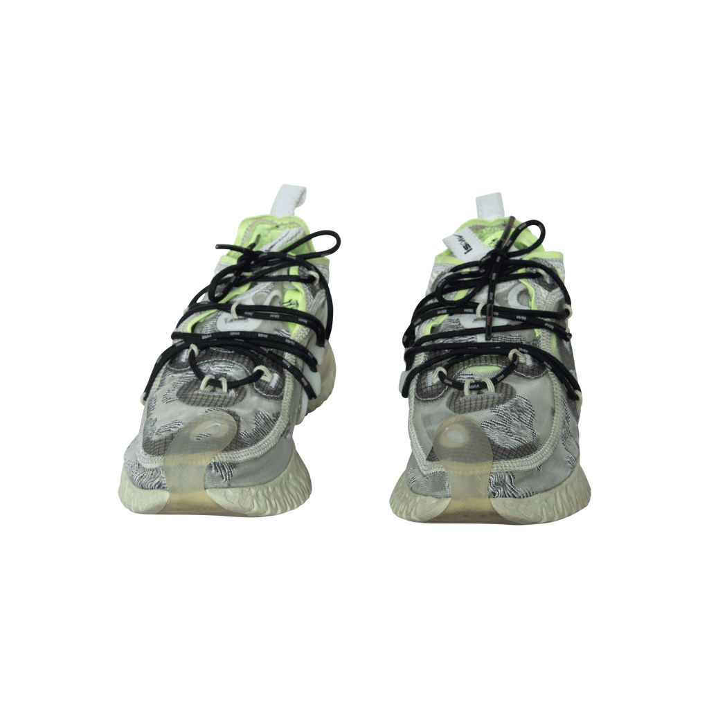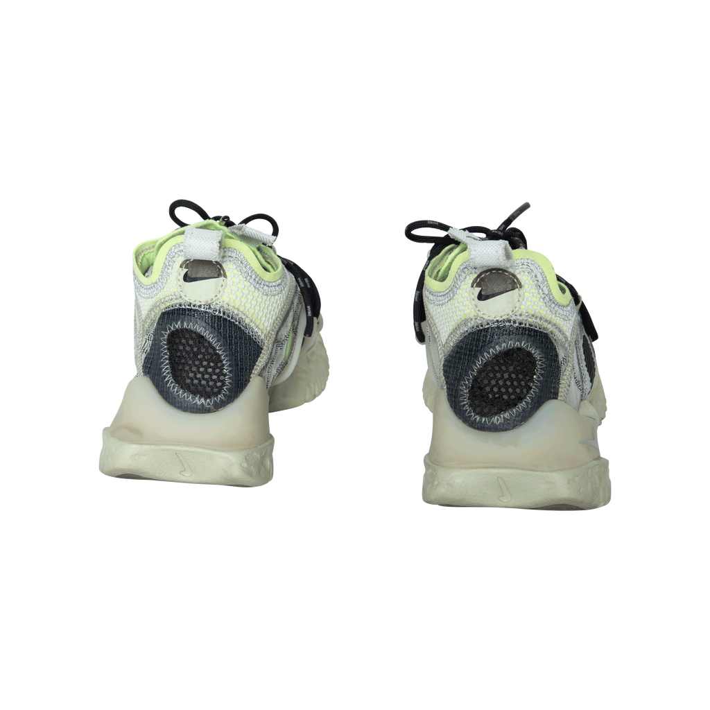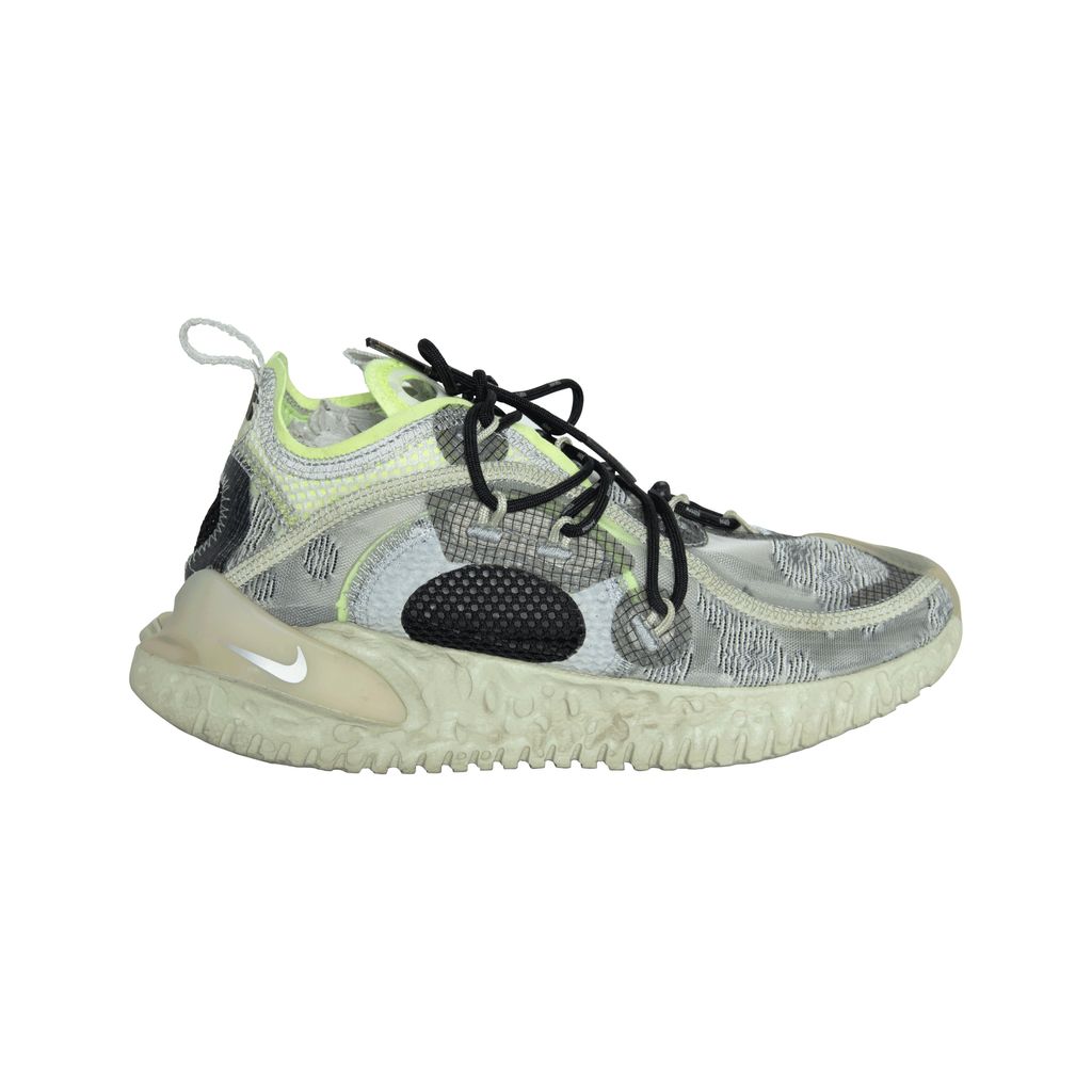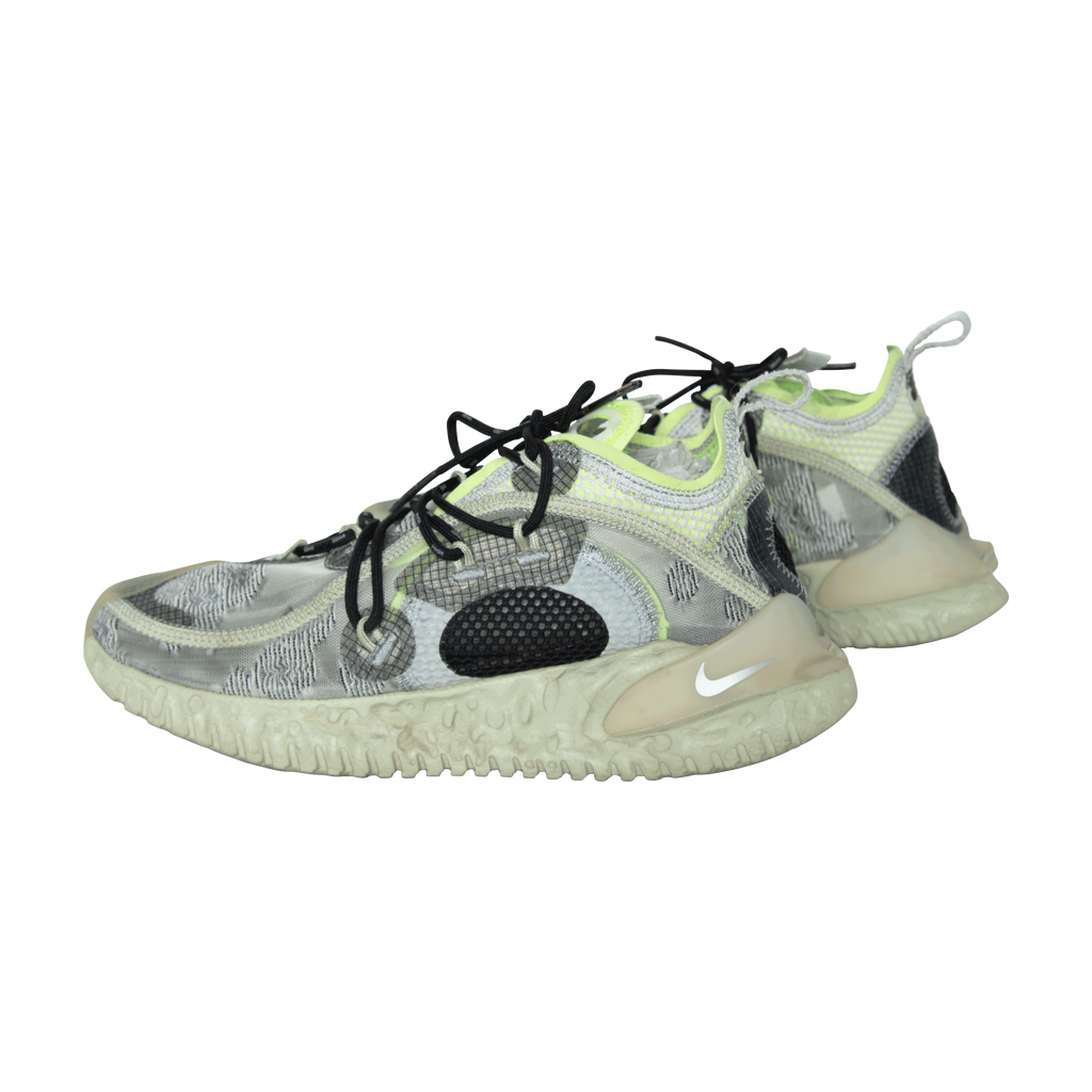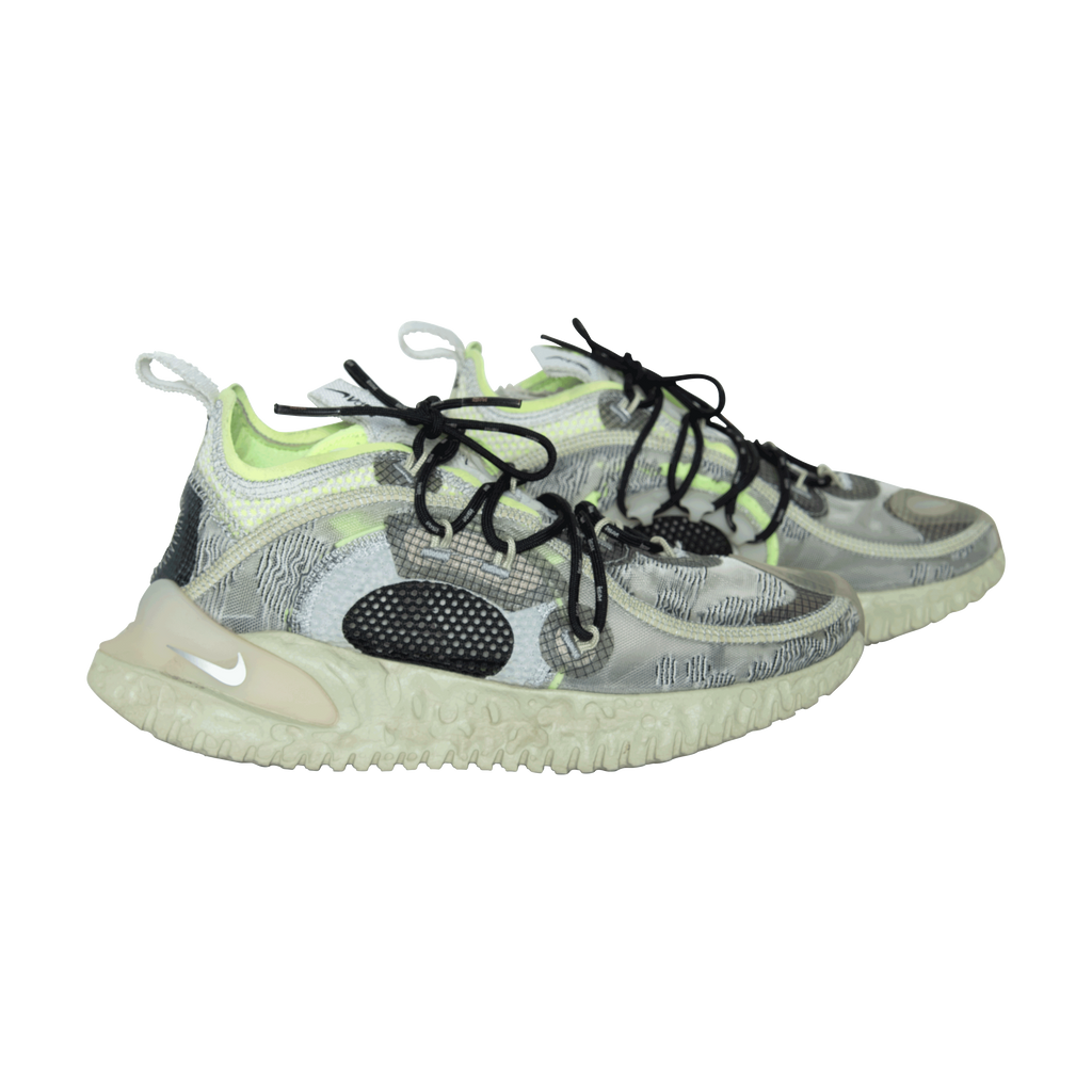 Nike ISPA Flow 2020 in Spruce Aura features bright green accents, semi-translucent textile upper, mono mesh windows, adaptive lacing, cored-out foam midsole, and translucent rubber under heel and toe.
