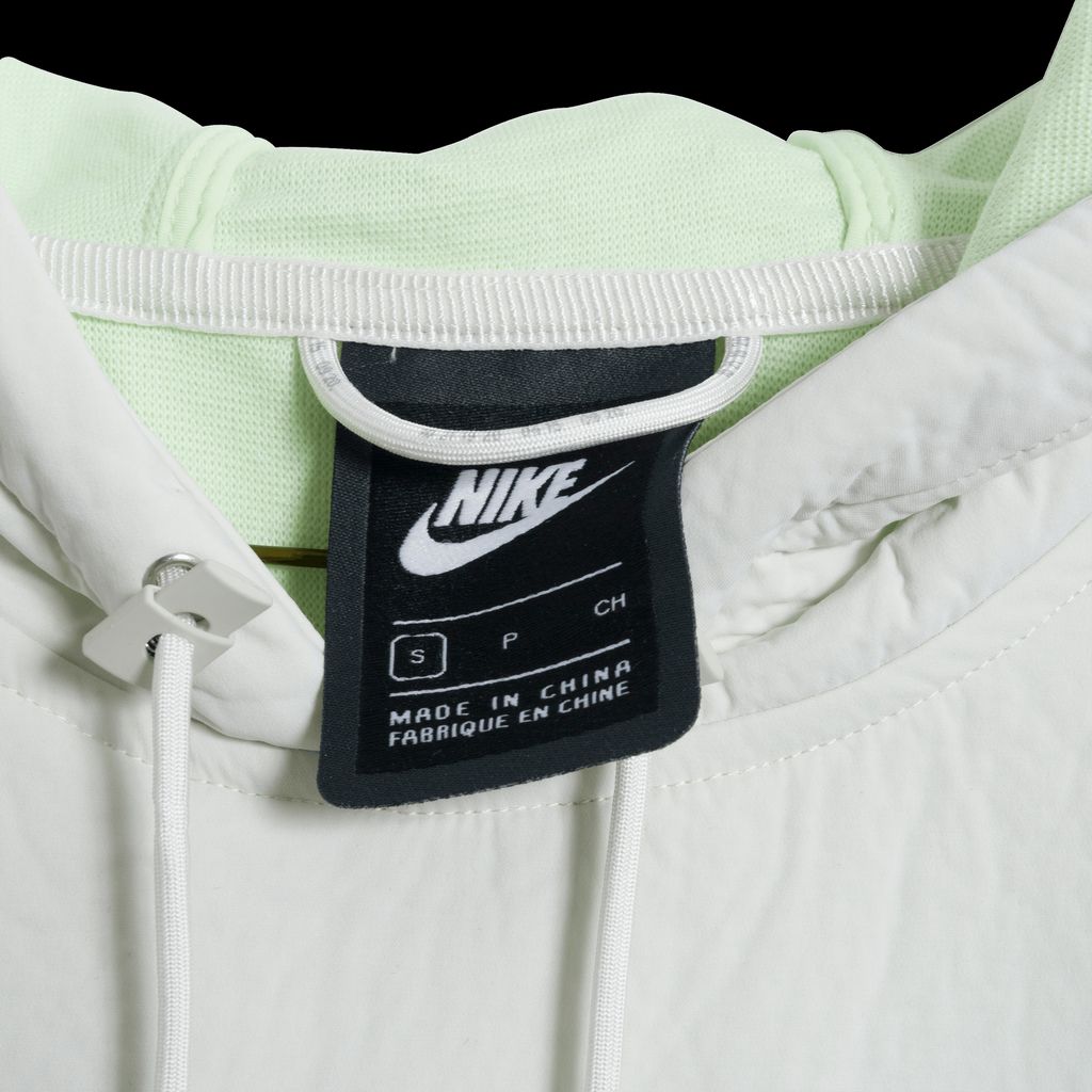 This amazing hoodie from Nike is a true innovator with its tech fabric and packable construction. Features neon green hood, crinkle fabric detail, and front pocket with strap that hoodie can fold into for on the go moments. In amazing condition.