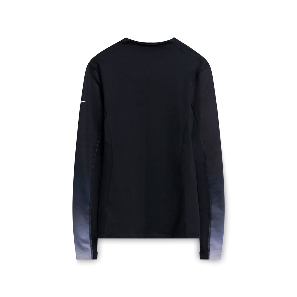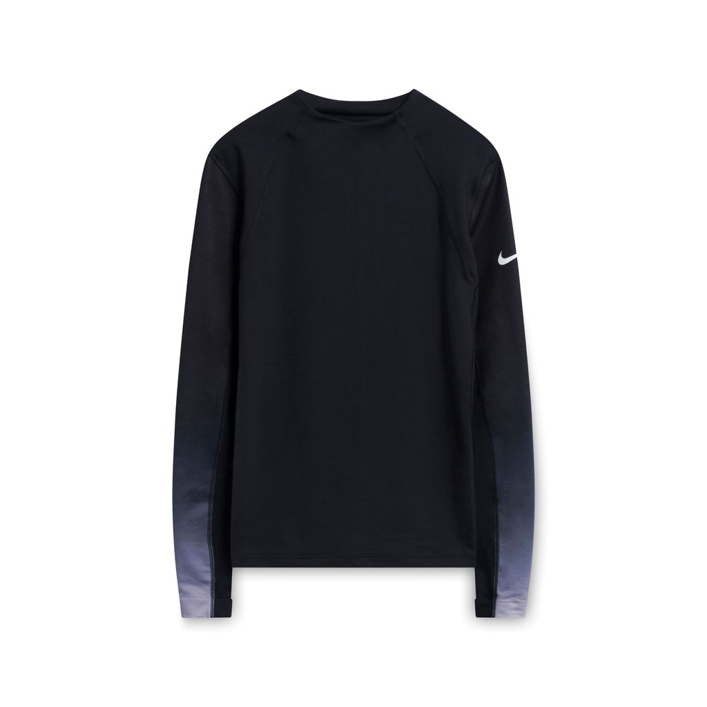 Black long sleeve top with a high neckline, mesh underarms, and a decorative ombre going from black to grey on both arms. The white Nike logo is in rubberized material on certain parts of the shirt. Both sleeves also feature a thumb hole to help keep your hands warm.